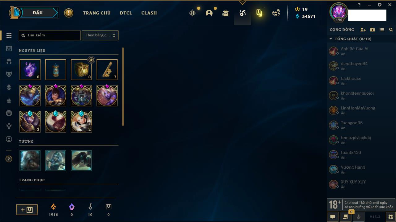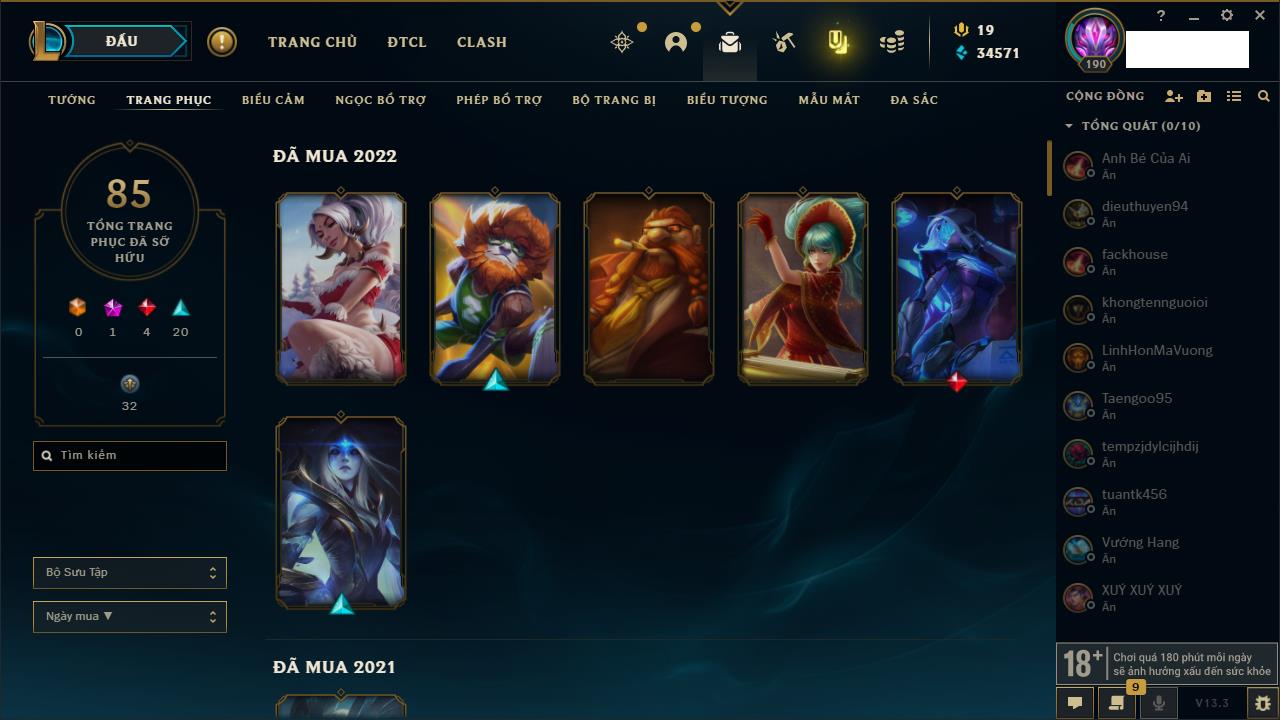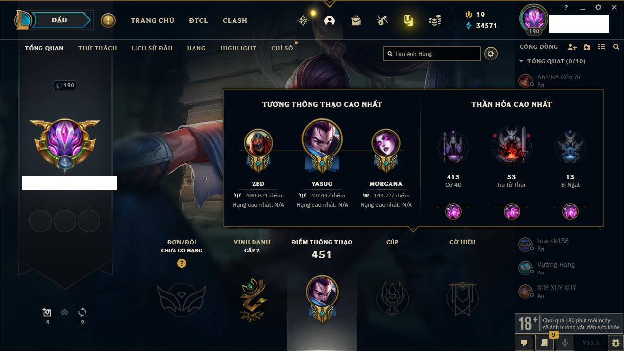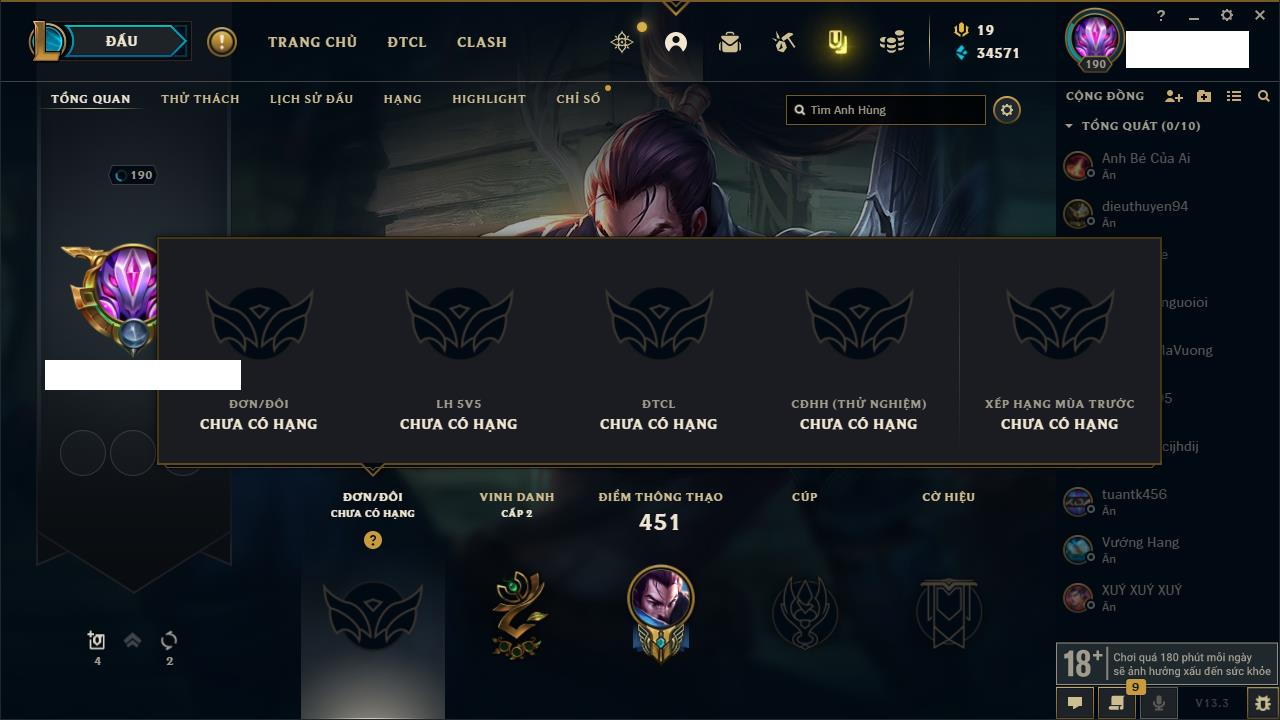 Rank Đơn: Chưa rank mùa nàoKhung: Chưa có khungTướng: 3 - Còn 34550 THXTrang Phục: 0Rank ĐTCL: Bạch Kim IVLinh Thú: 41