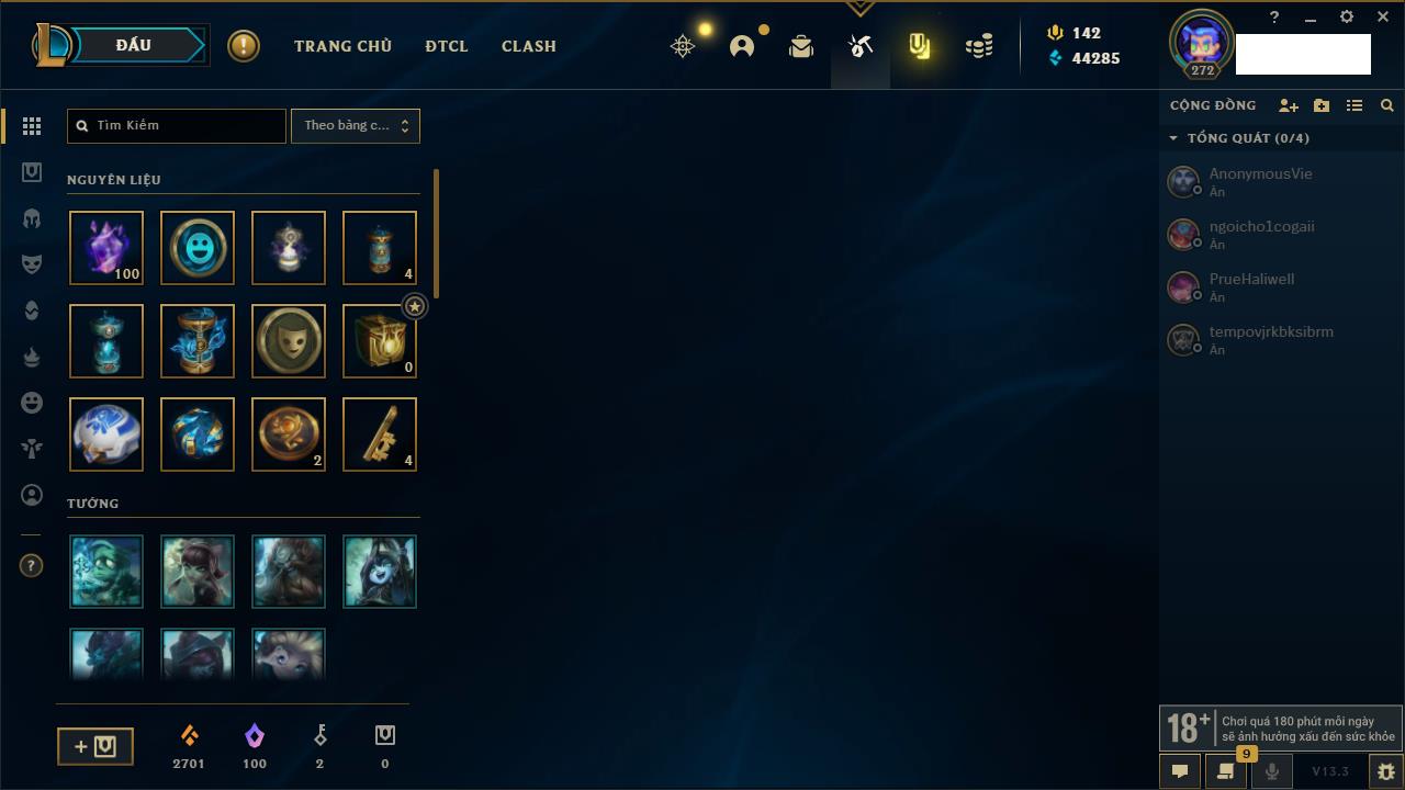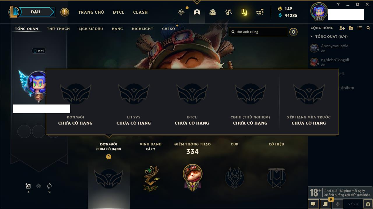 Rank Đơn: Đồng IIKhung: Chưa có khungTướng: 170 - Còn 56487 THXTrang Phục: 90Rank ĐTCL: Chưa RankLinh Thú: 129