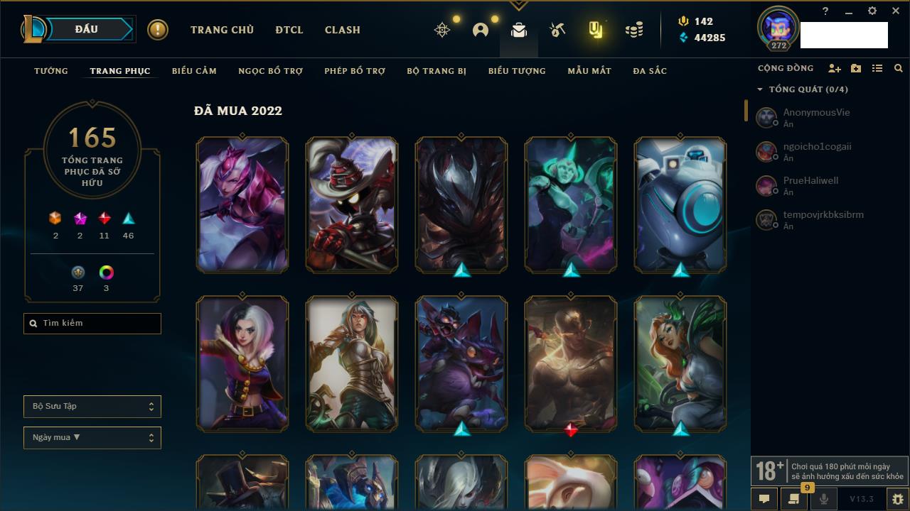 Rank Đơn: Vàng IIIKhung: VàngTướng: 170 - Còn 33222 THXTrang Phục: 136Rank ĐTCL: Chưa RankLinh Thú: 40
