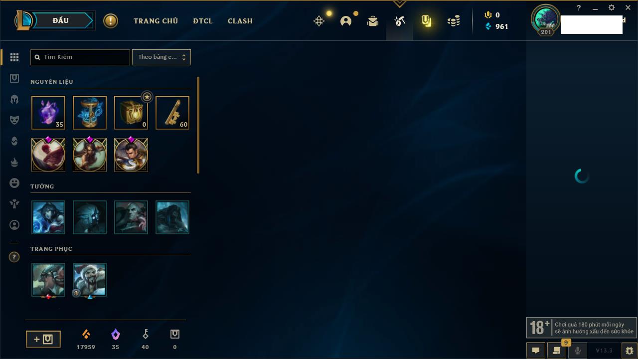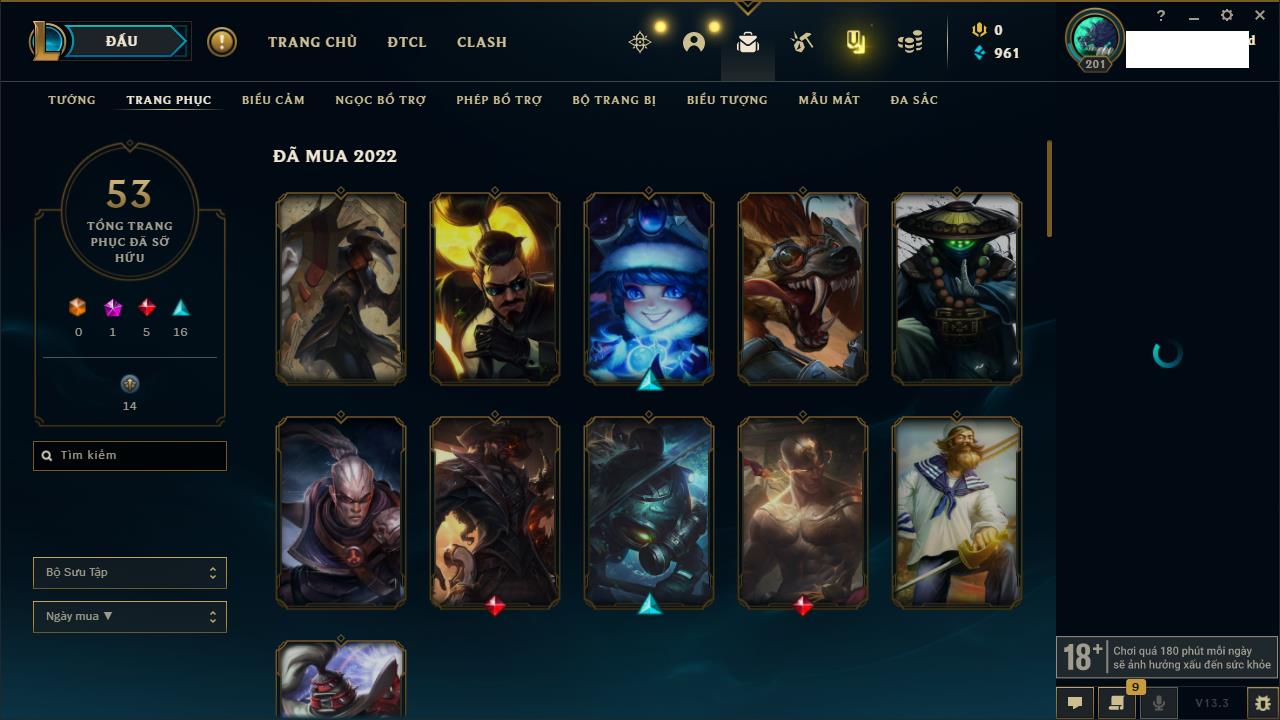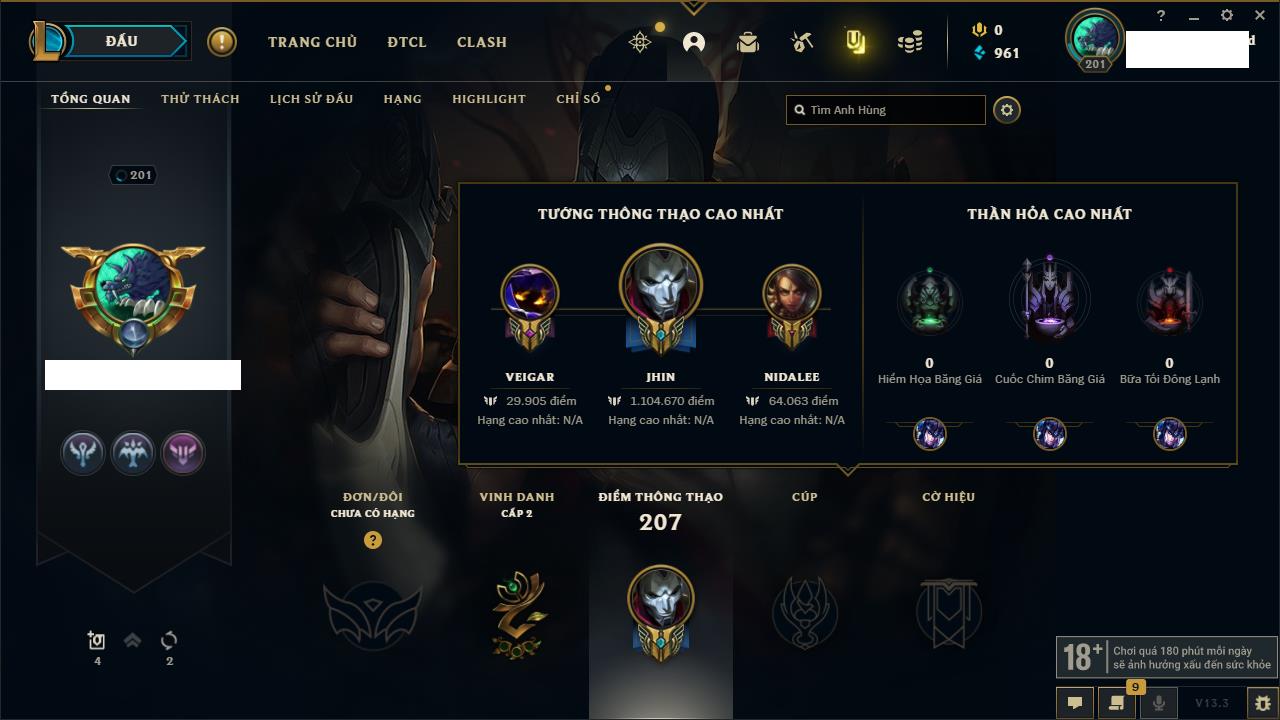 Rank Đơn: Vàng IVKhung: VàngTướng: 171 - Còn 48721 THXTrang Phục: 171Rank ĐTCL: Chưa RankLinh Thú: 27