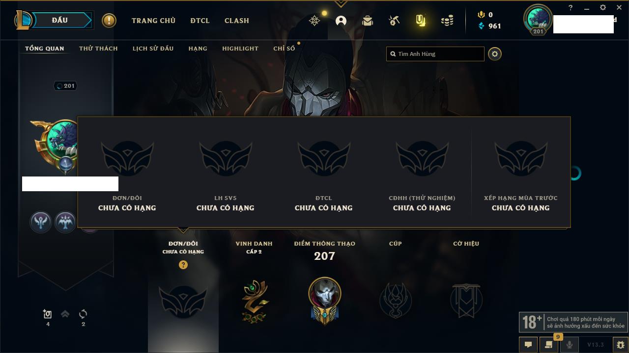 Rank Đơn: Bạc IIKhung: VàngTướng: 171 - Còn 332462 THXTrang Phục: 165Rank ĐTCL: Kim Cương IVLinh Thú: 181