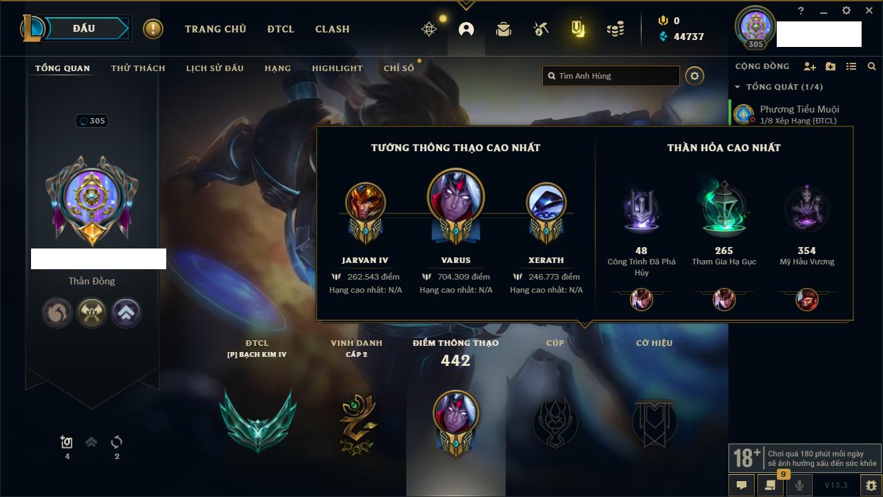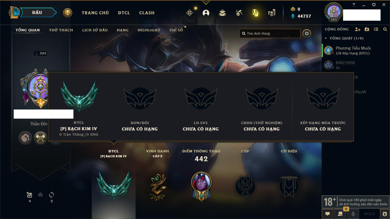 Rank Đơn: Vàng IVKhung: VàngTướng: 146 - Còn 89110 THXTrang Phục: 63Rank ĐTCL: Vàng IIILinh Thú: 41