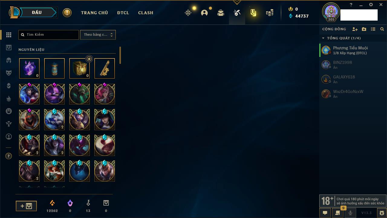 Rank Đơn: Đồng IIKhung: Chưa có khungTướng: 170 - Còn 56487 THXTrang Phục: 90Rank ĐTCL: Chưa RankLinh Thú: 129