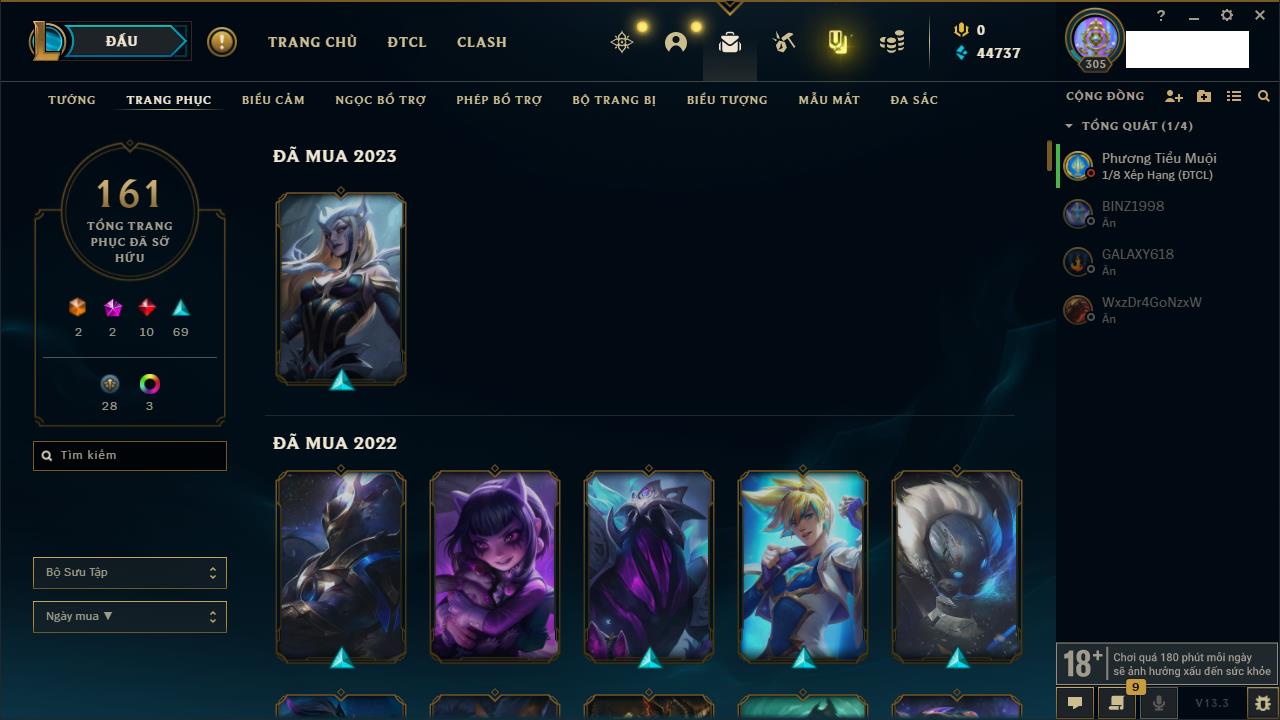 Rank Đơn: Vàng IIIKhung: VàngTướng: 170 - Còn 33222 THXTrang Phục: 136Rank ĐTCL: Chưa RankLinh Thú: 40