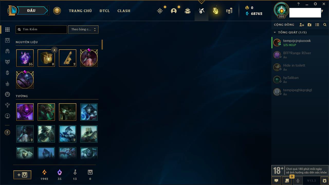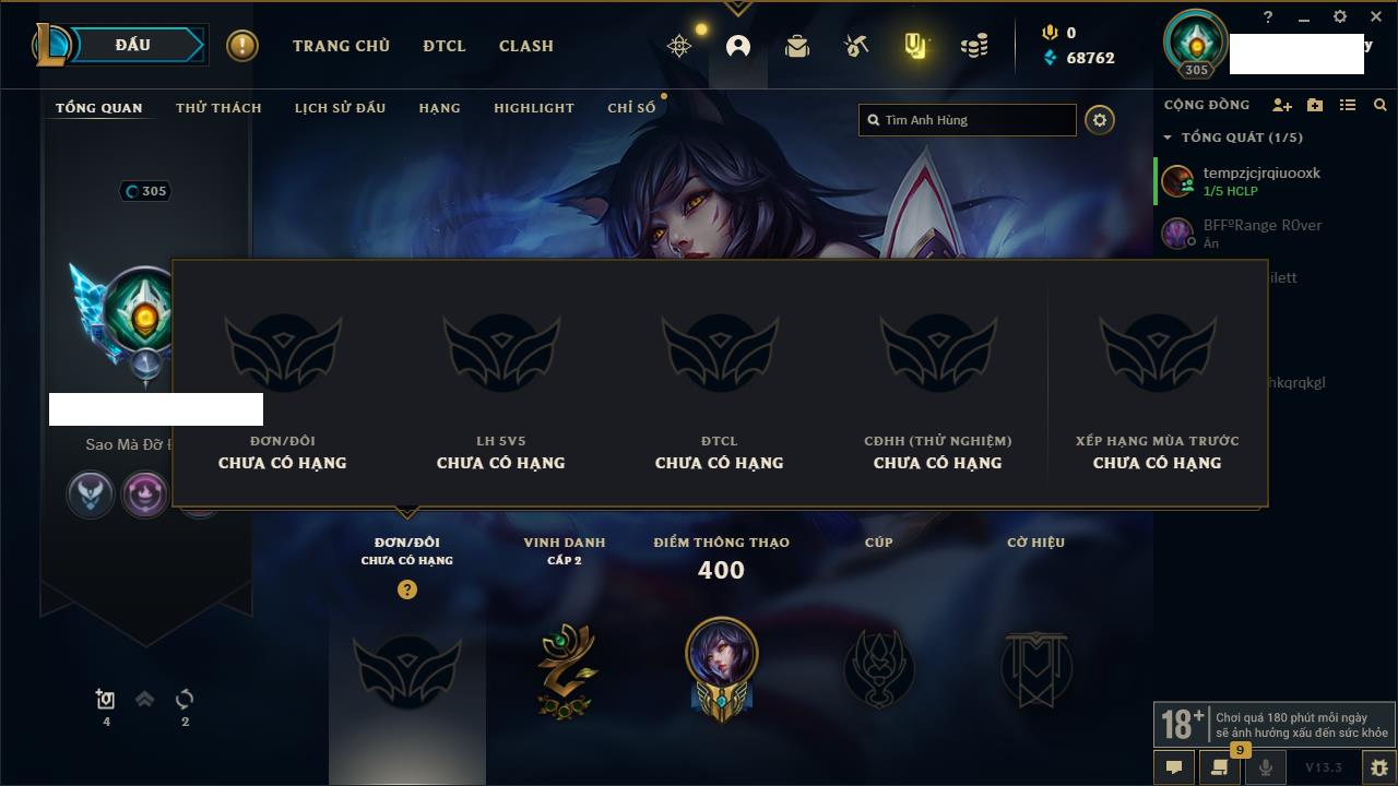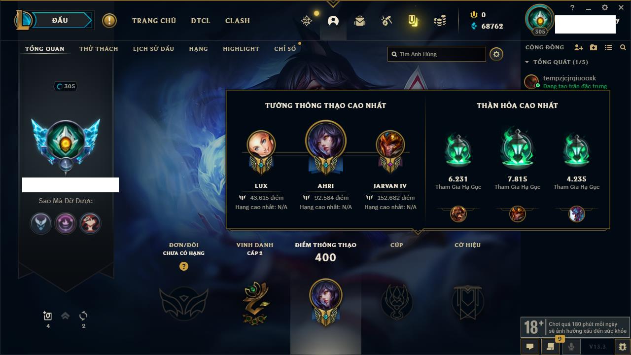 Rank Đơn: Đồng IIKhung: Chưa có khungTướng: 170 - Còn 56487 THXTrang Phục: 90Rank ĐTCL: Chưa RankLinh Thú: 129