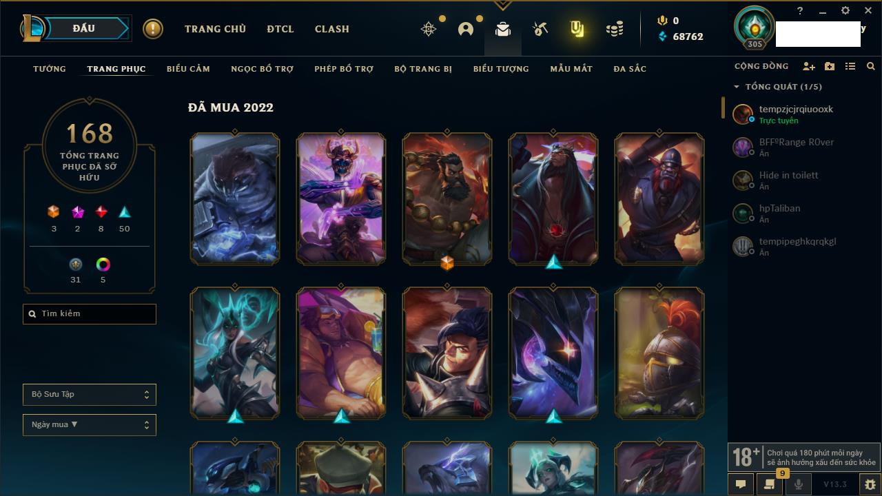 Rank Đơn: Vàng IIIKhung: VàngTướng: 170 - Còn 33222 THXTrang Phục: 136Rank ĐTCL: Chưa RankLinh Thú: 40