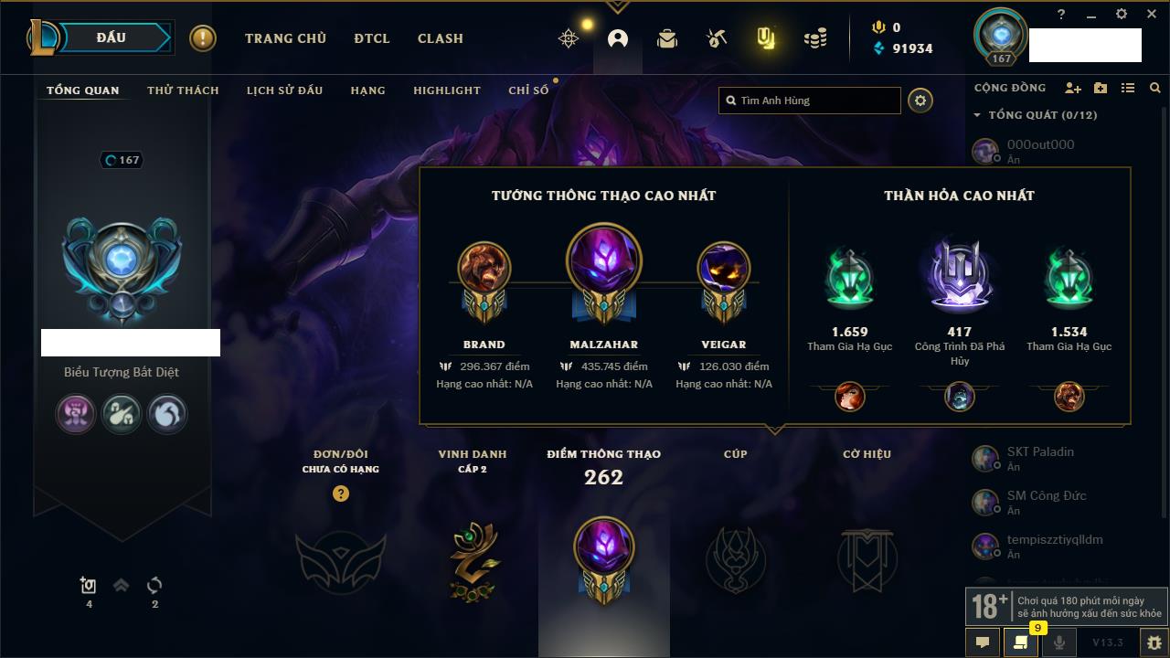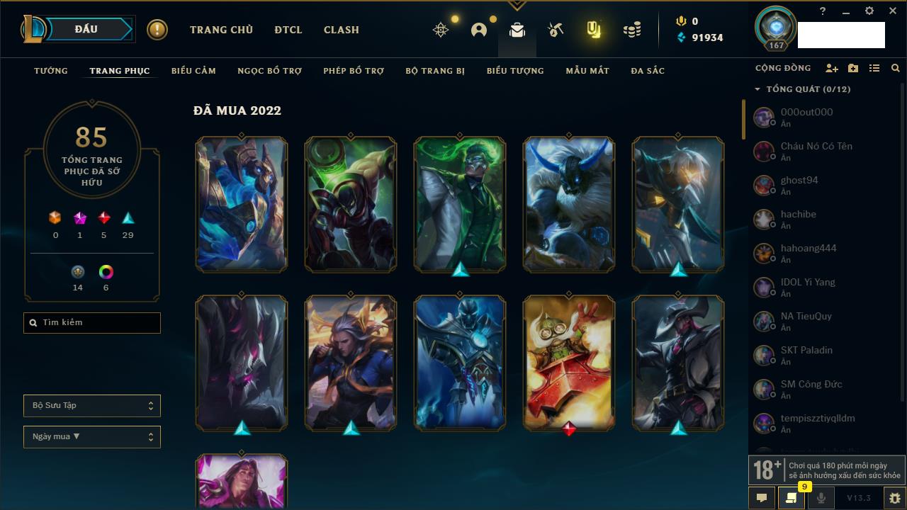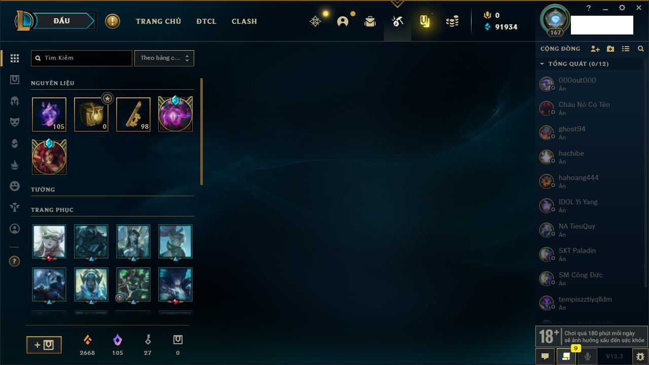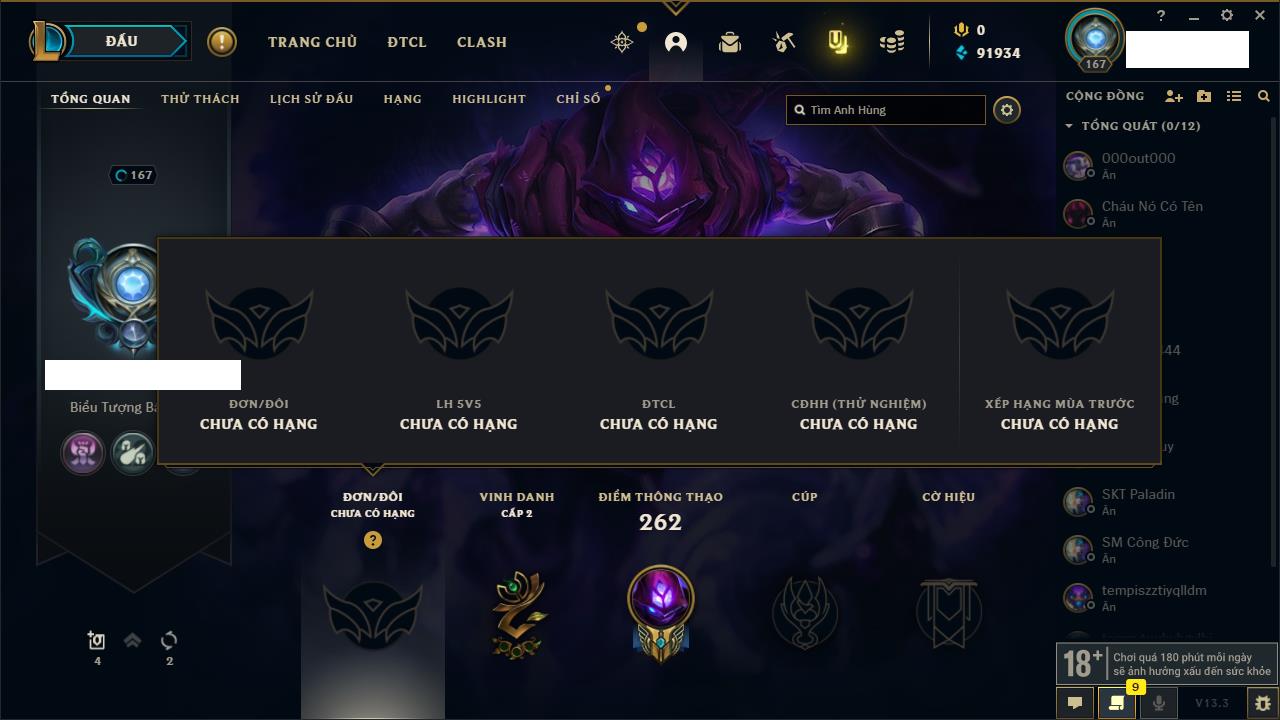 Rank Đơn: Chưa rank mùa nàoKhung: Chưa có khungTướng: 3 - Còn 34550 THXTrang Phục: 0Rank ĐTCL: Bạch Kim IVLinh Thú: 41