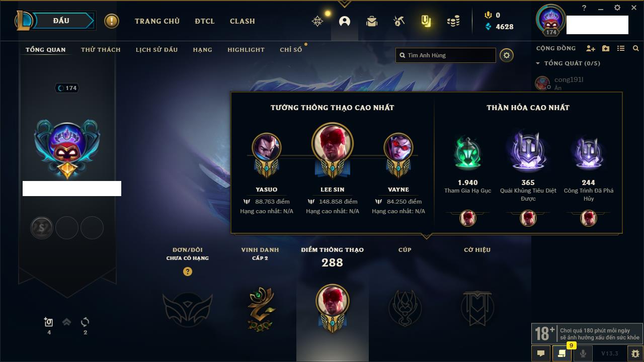Rank Đơn: Chưa rank mùa nàoKhung: Chưa có khungTướng: 108 - Còn 6515 THXTrang Phục: 23Rank ĐTCL: Chưa RankLinh Thú: 111