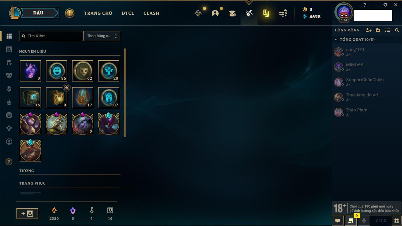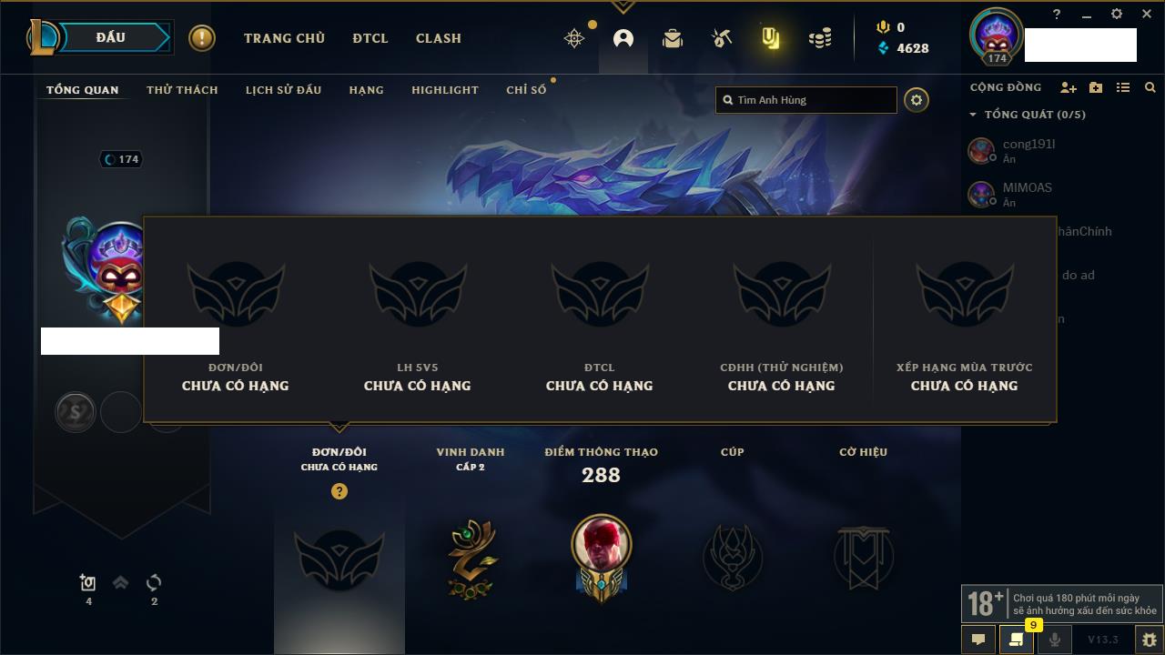 Rank Đơn: Vàng IIIKhung: VàngTướng: 77 - Còn 21172 THXTrang Phục: 8Rank ĐTCL: Kim Cương IIILinh Thú: 23