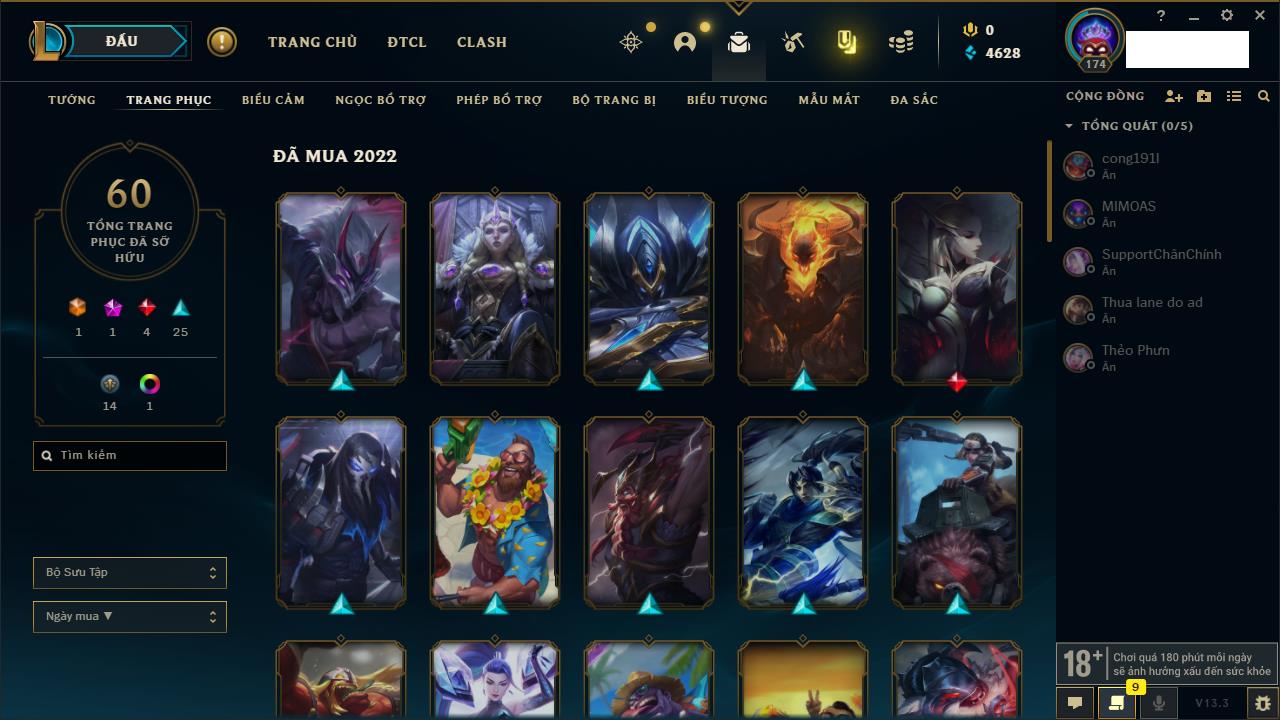 Rank Đơn: Vàng IIIKhung: BạcTướng: 56 - Còn 910 THXTrang Phục: 9Rank ĐTCL: Chưa RankLinh Thú: 31