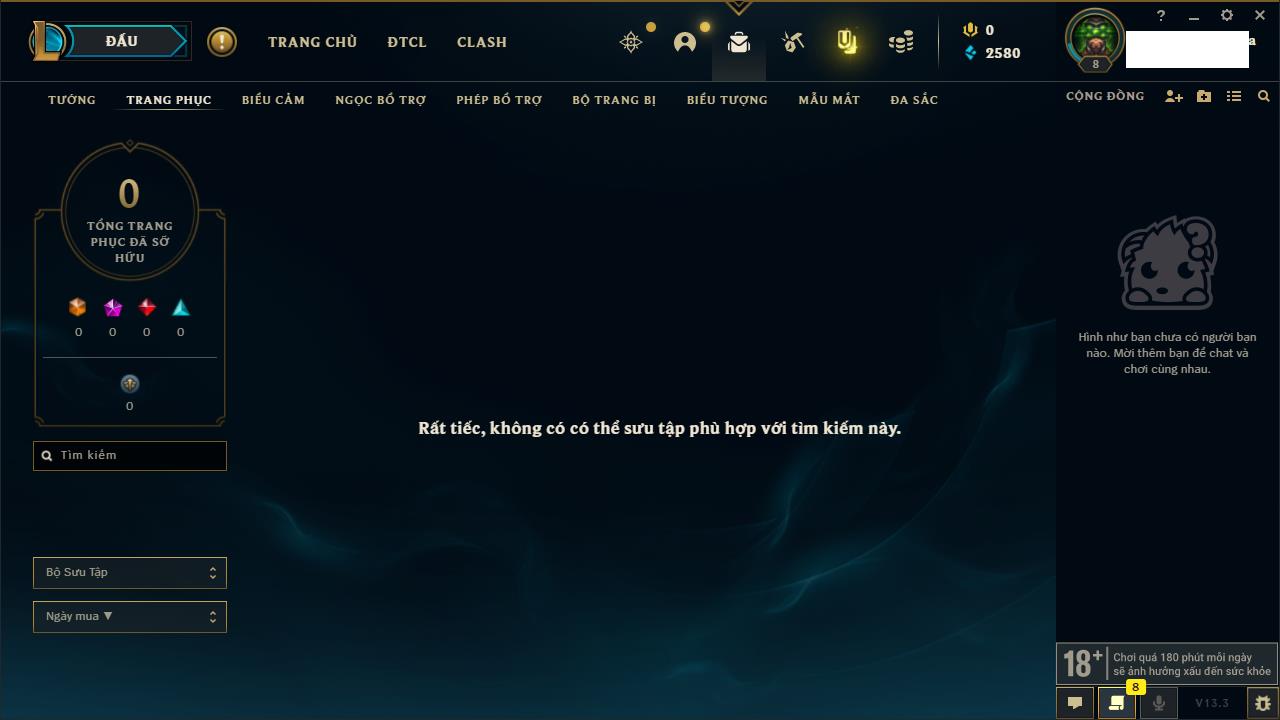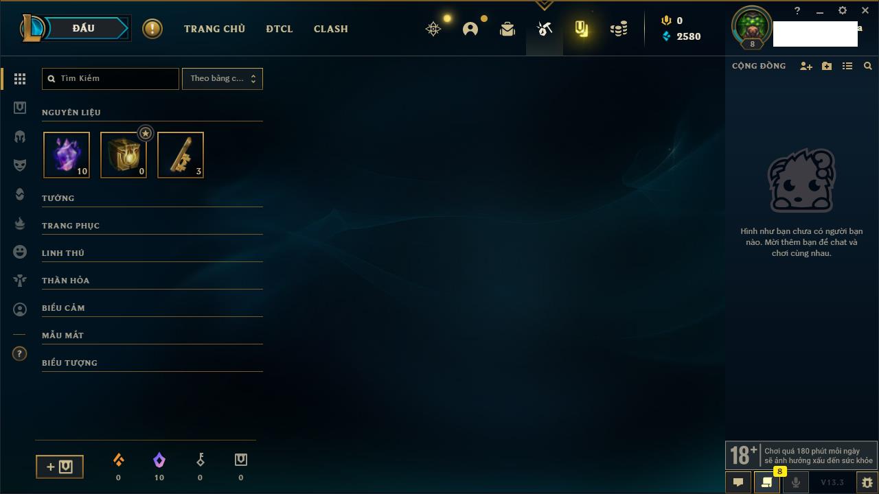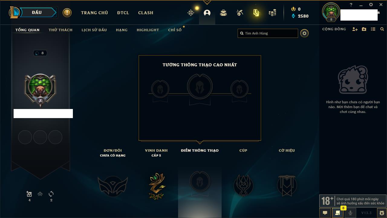 Rank Đơn: Chưa rank mùa nào Khung: Chưa có khung Tướng: 0 - Còn 0 THX Trang Phục: 0 Rank ĐTCL: Chưa Rank Linh Thú: 21