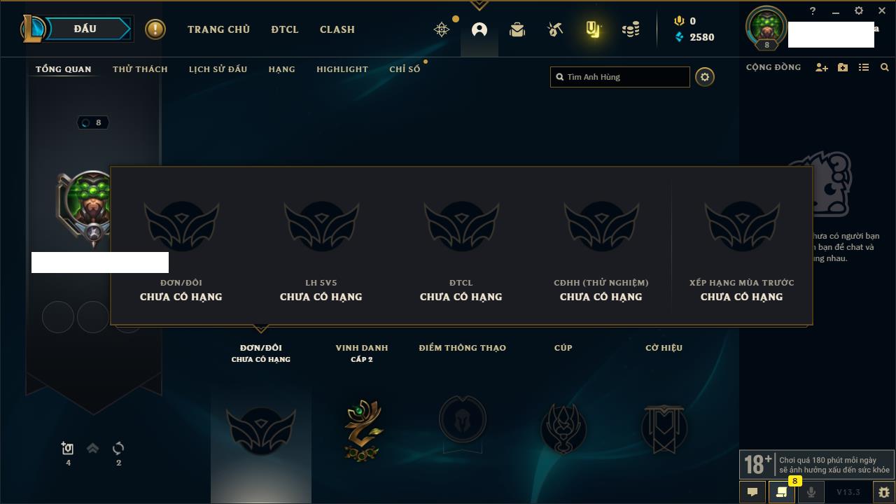Rank Đơn: Chưa rank mùa nào Khung: Chưa có khung Tướng: 0 - Còn 0 THX Trang Phục: 0 Rank ĐTCL: Chưa Rank Linh Thú: 27