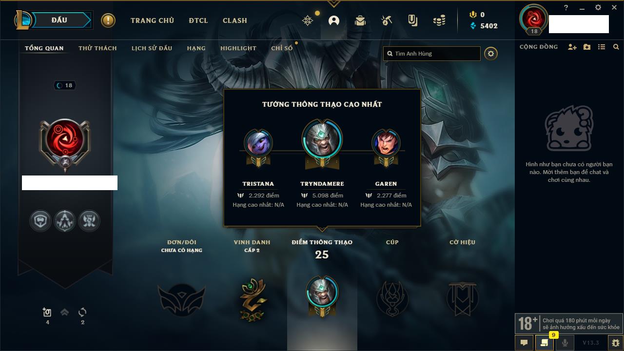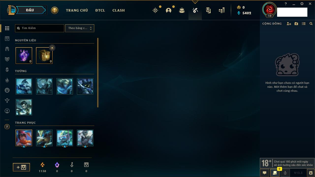 Rank Đơn: Chưa RankKhung: Chưa có khungTướng: 0 - Còn 2000 THXTrang Phục: 0Rank ĐTCL: Chưa RankLinh Thú: 15