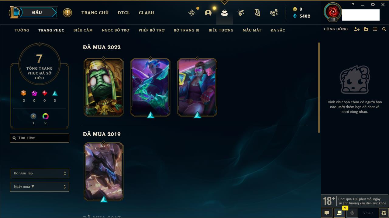 Rank Đơn: Chưa RankKhung: Chưa có khungTướng: 0 - Còn 0 THXTrang Phục: 0Rank ĐTCL: Chưa RankLinh Thú: 8