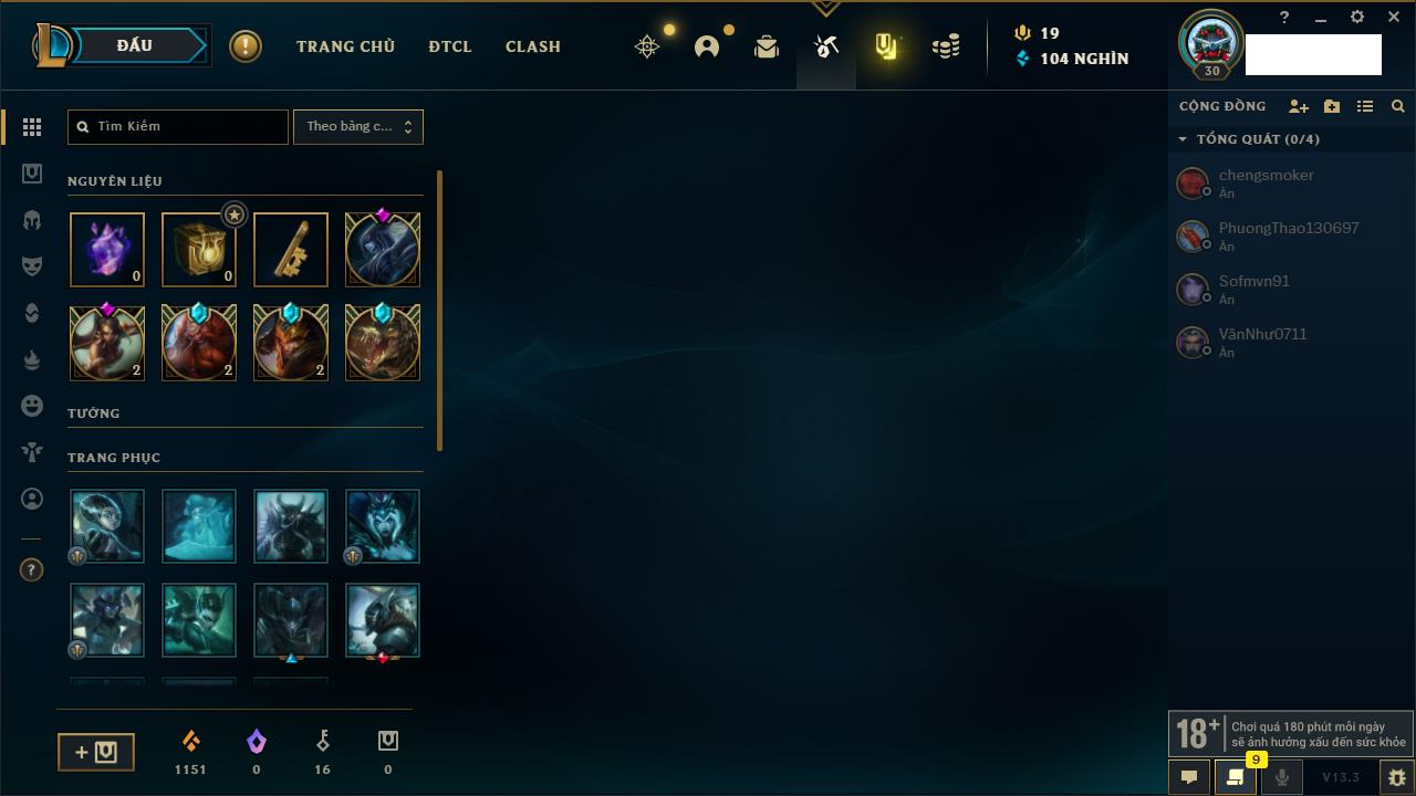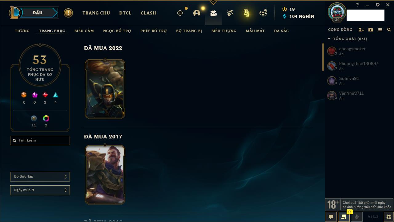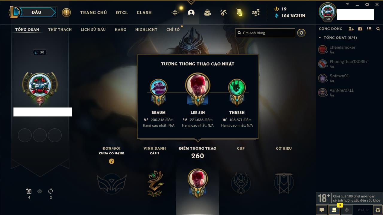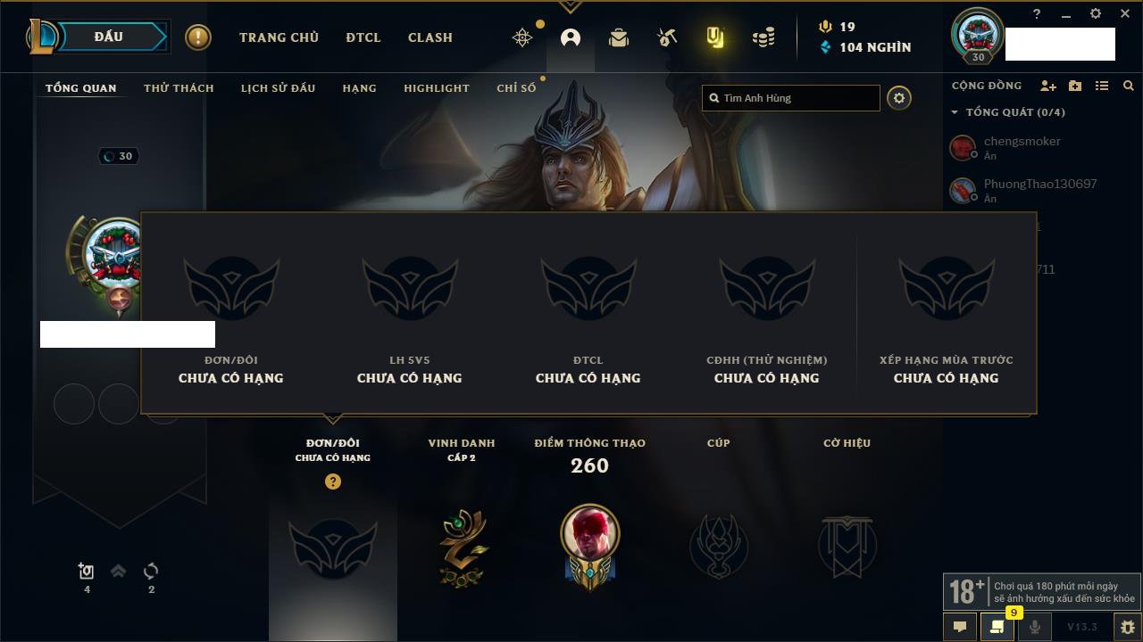 - Có pét - Garen Sư Vương Đột PháRank Đơn: Bạch Kim IIKhung: Bạch kimTướng: 171 - Còn 263986 THXTrang Phục: 306Rank ĐTCL: Lục Bảo IVLinh Thú: 961.250.000 đ CARD 1.000.000 đ ATM -
