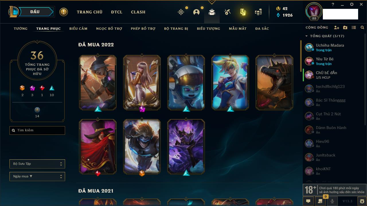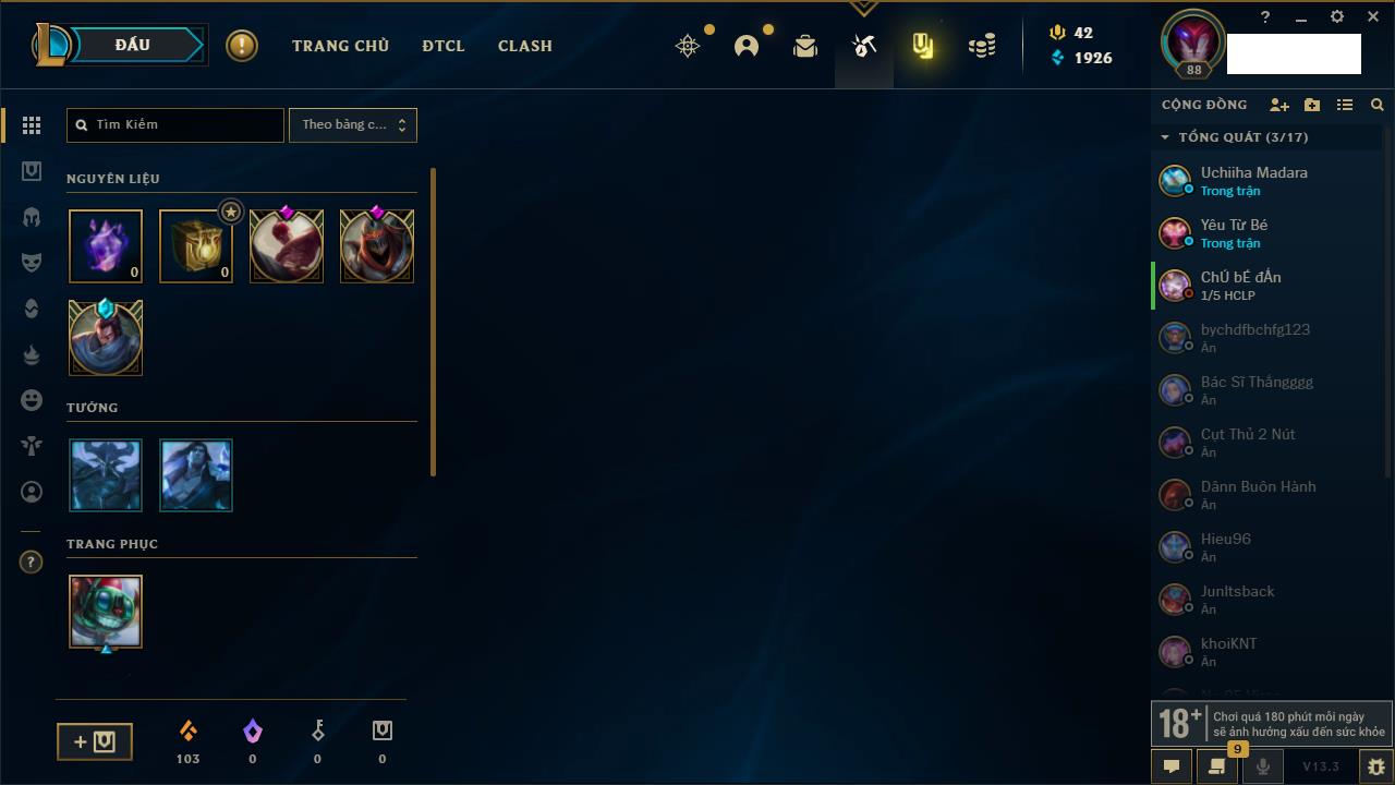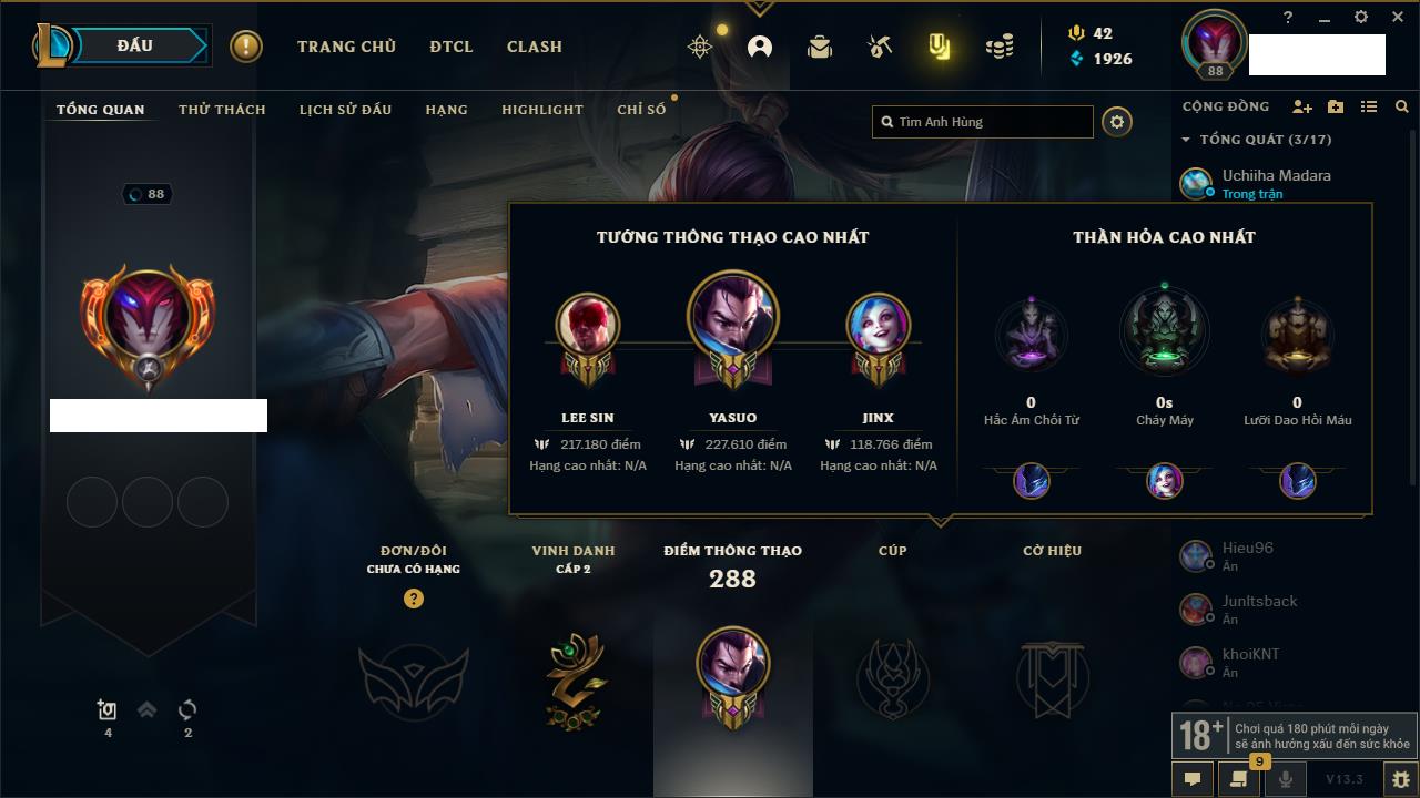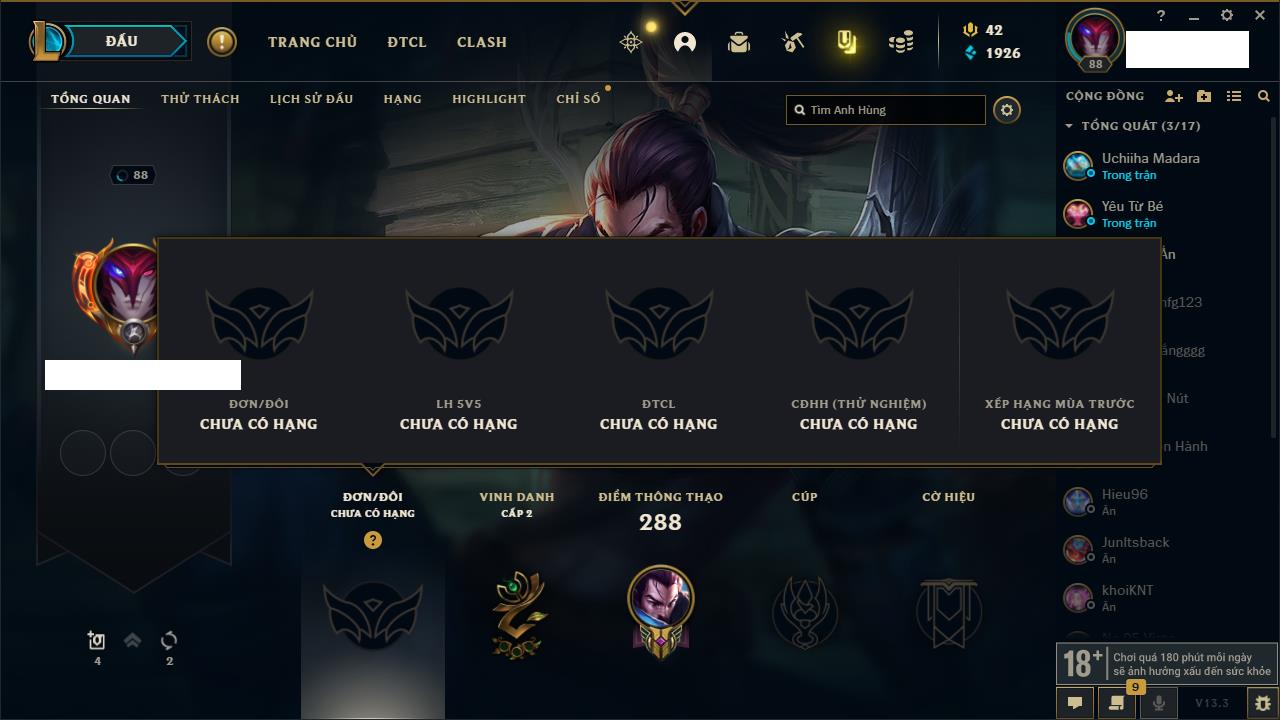 Rank Đơn: Chưa RankKhung: Chưa có khungTướng: 165 - Còn 3214 THXTrang Phục: 160Rank ĐTCL: Chưa RankLinh Thú: 28