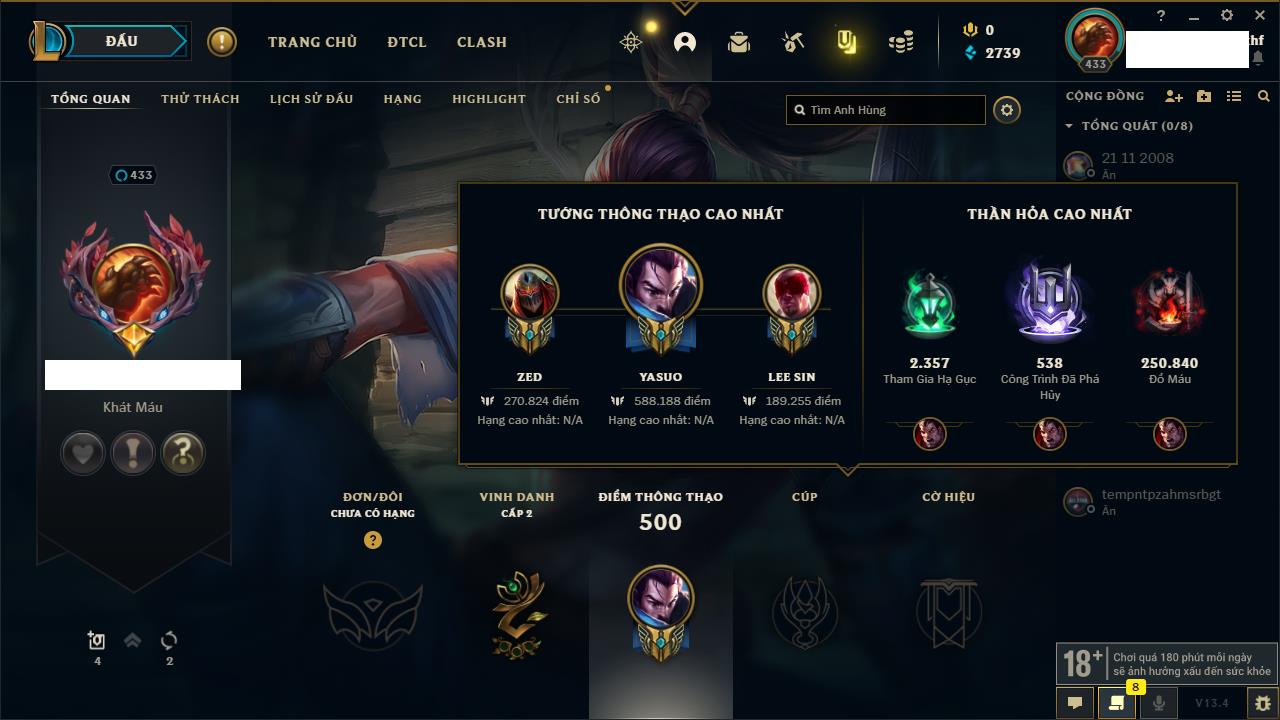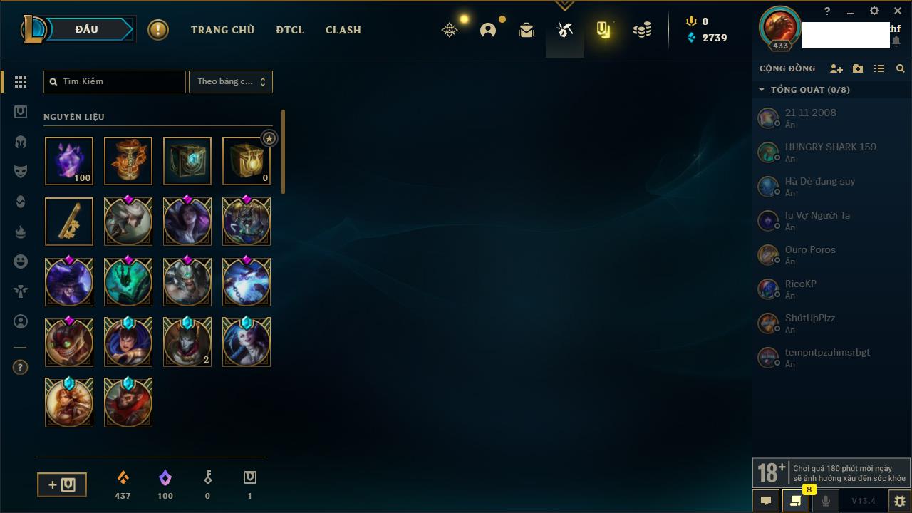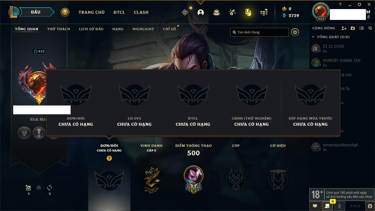 Rank Đơn: Vàng IKhung: BạcTướng: 171 - Còn 60584 THXTrang Phục: 286Rank ĐTCL: Vàng IIILinh Thú: 117