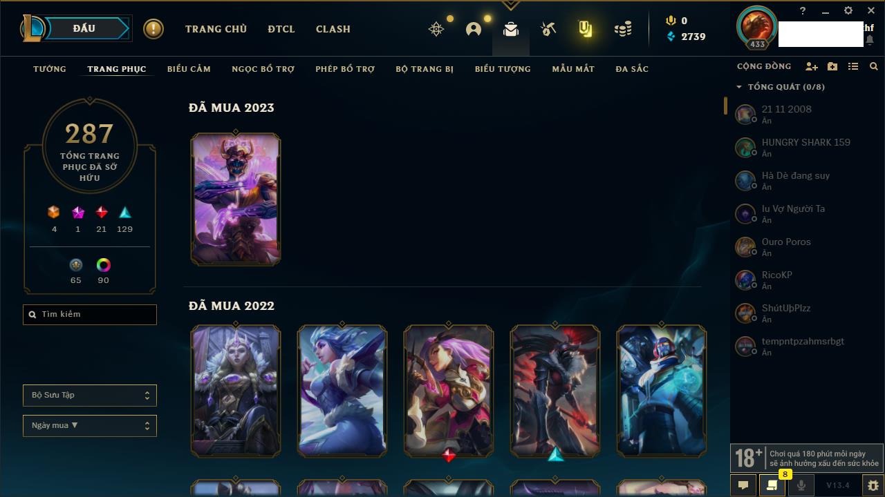 Rank Đơn: Vàng IIIKhung: VàngTướng: 171 - Còn 88128 THXTrang Phục: 329Rank ĐTCL: Chưa RankLinh Thú: 41