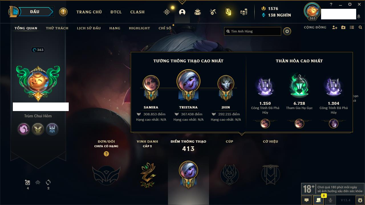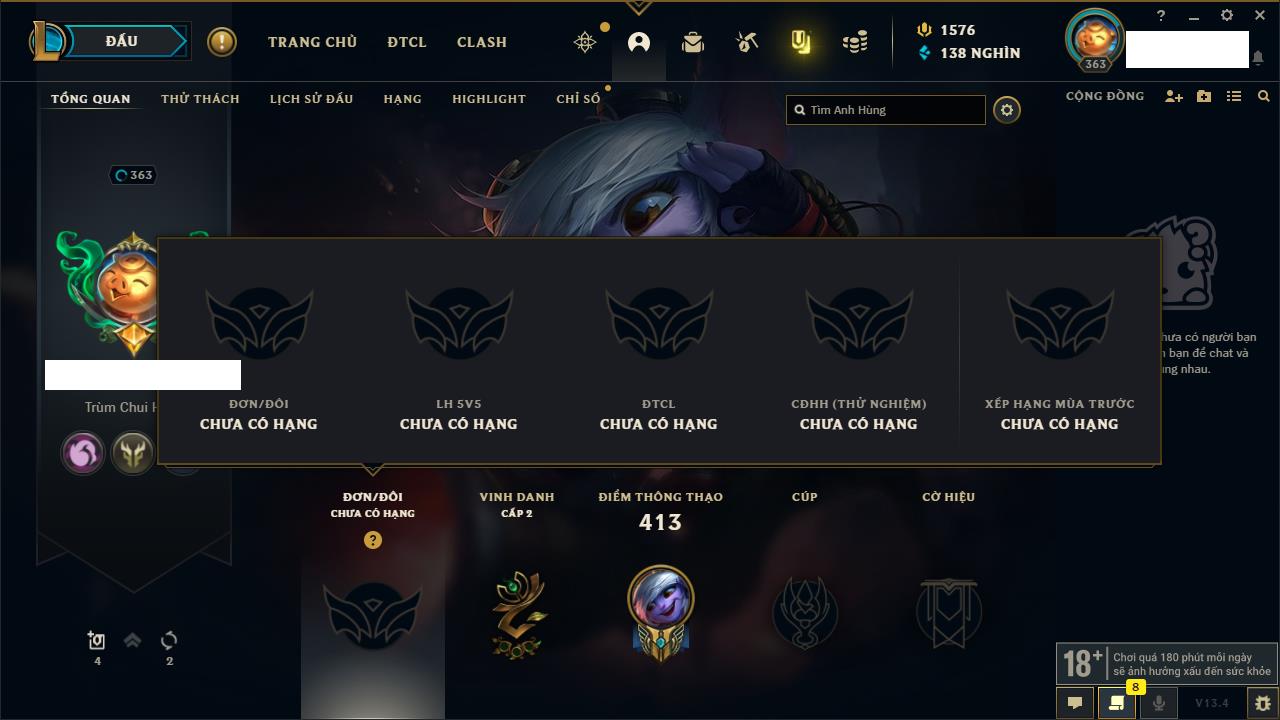 Rank Đơn: Bạch Kim IIKhung: Bạch kimTướng: 171 - Còn 263986 THXTrang Phục: 306Rank ĐTCL: Lục Bảo IVLinh Thú: 96