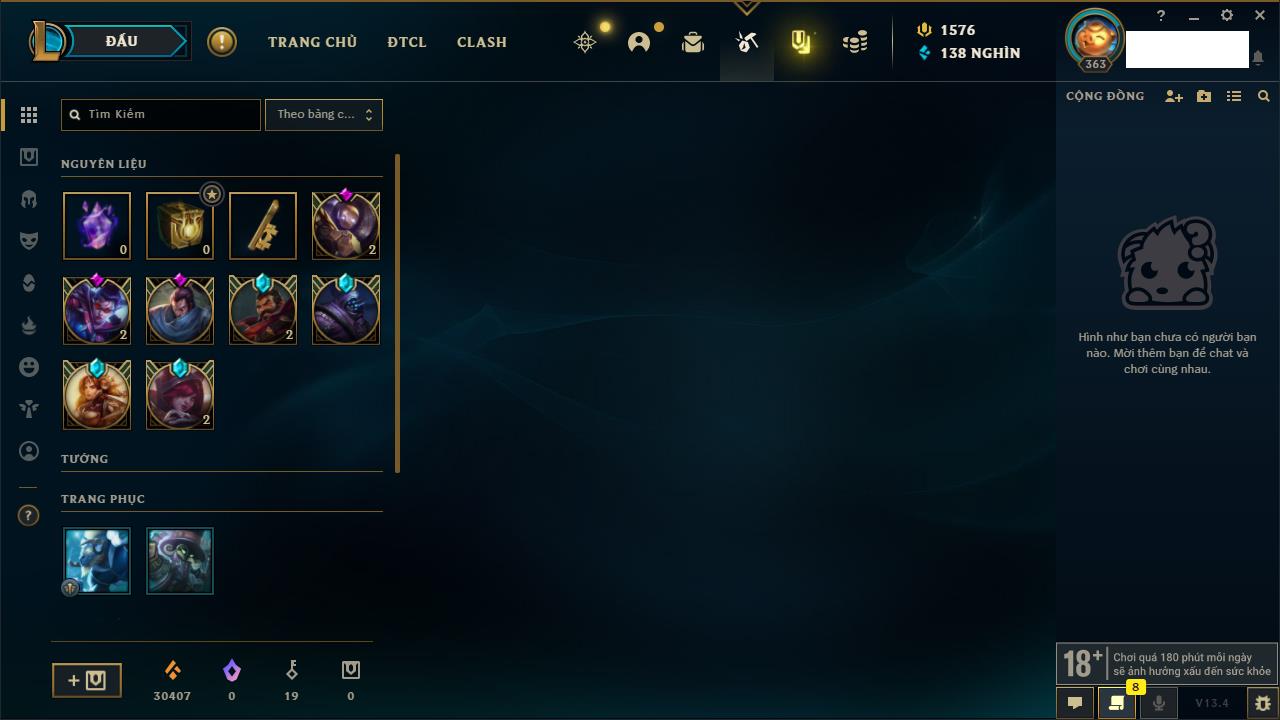 Rank Đơn: Bạch Kim IVKhung: Bạch kimTướng: 171 - Còn 182788 THXTrang Phục: 158Rank ĐTCL: Lục Bảo IVLinh Thú: 56