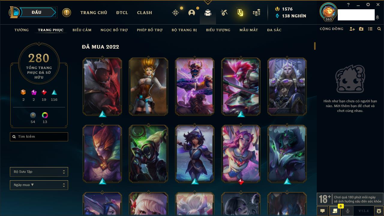 Rank Đơn: Vàng IKhung: Bạch kimTướng: 170 - Còn 212450 THXTrang Phục: 214Rank ĐTCL: Bạch Kim IVLinh Thú: 221