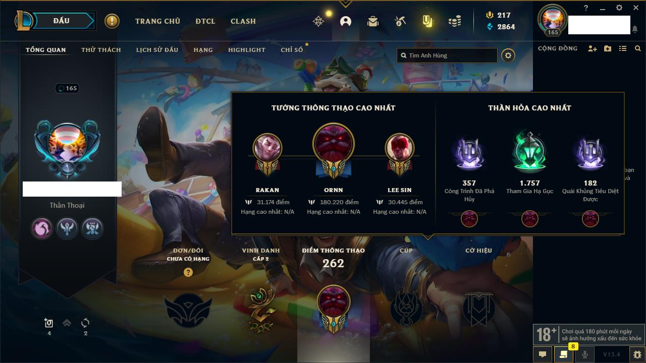 Rank Đơn: Đồng IKhung: ĐồngTướng: 168 - Còn 11447 THXTrang Phục: 245Rank ĐTCL: Chưa RankLinh Thú: 53