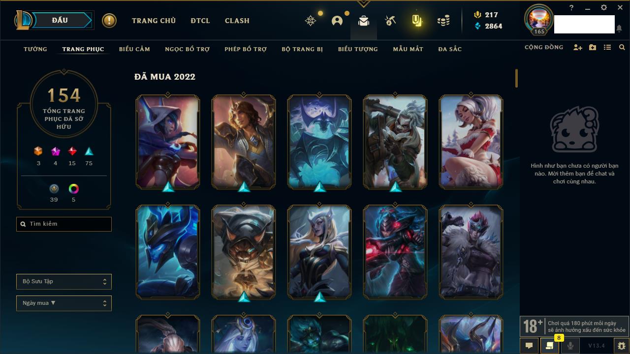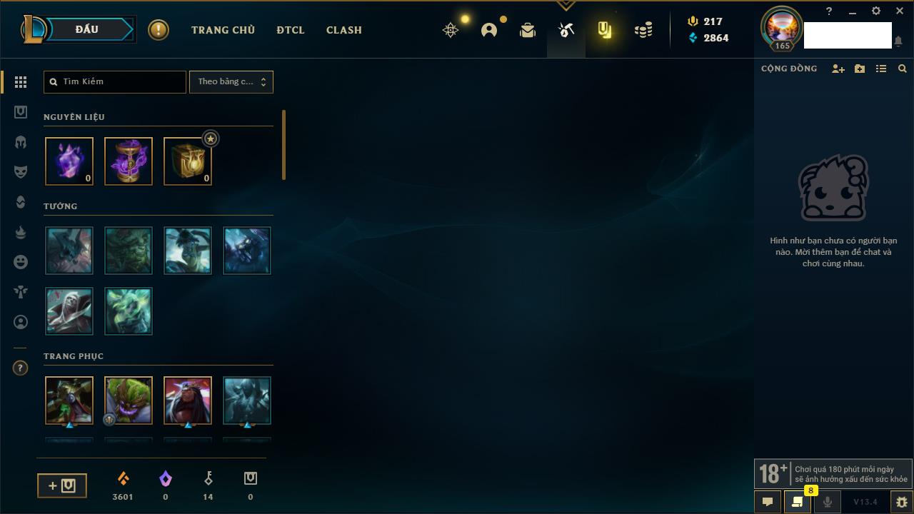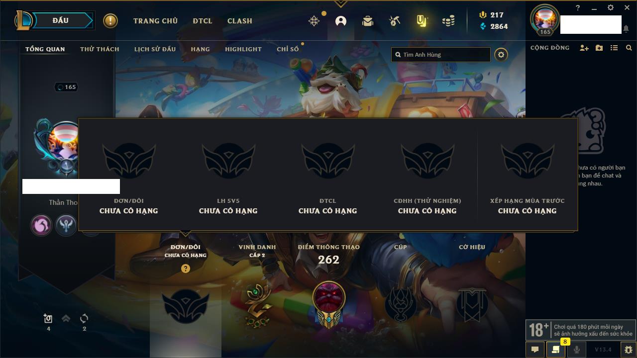 Rank Đơn: Vàng IIIKhung: BạcTướng: 171 - Còn 101359 THXTrang Phục: 88Rank ĐTCL: Kim Cương IVLinh Thú: 200