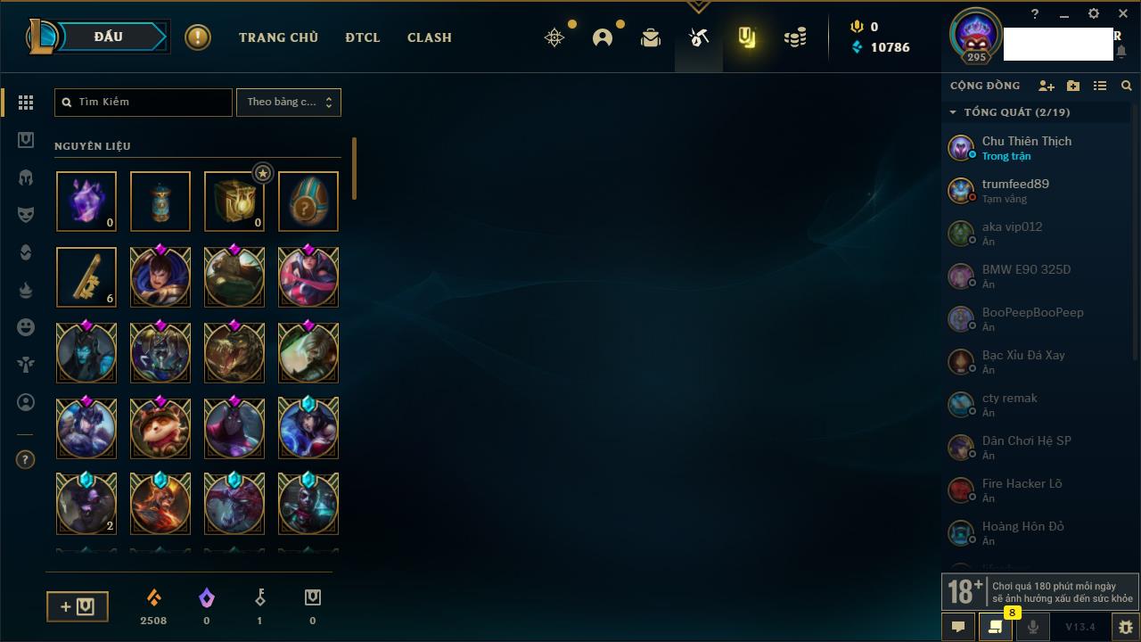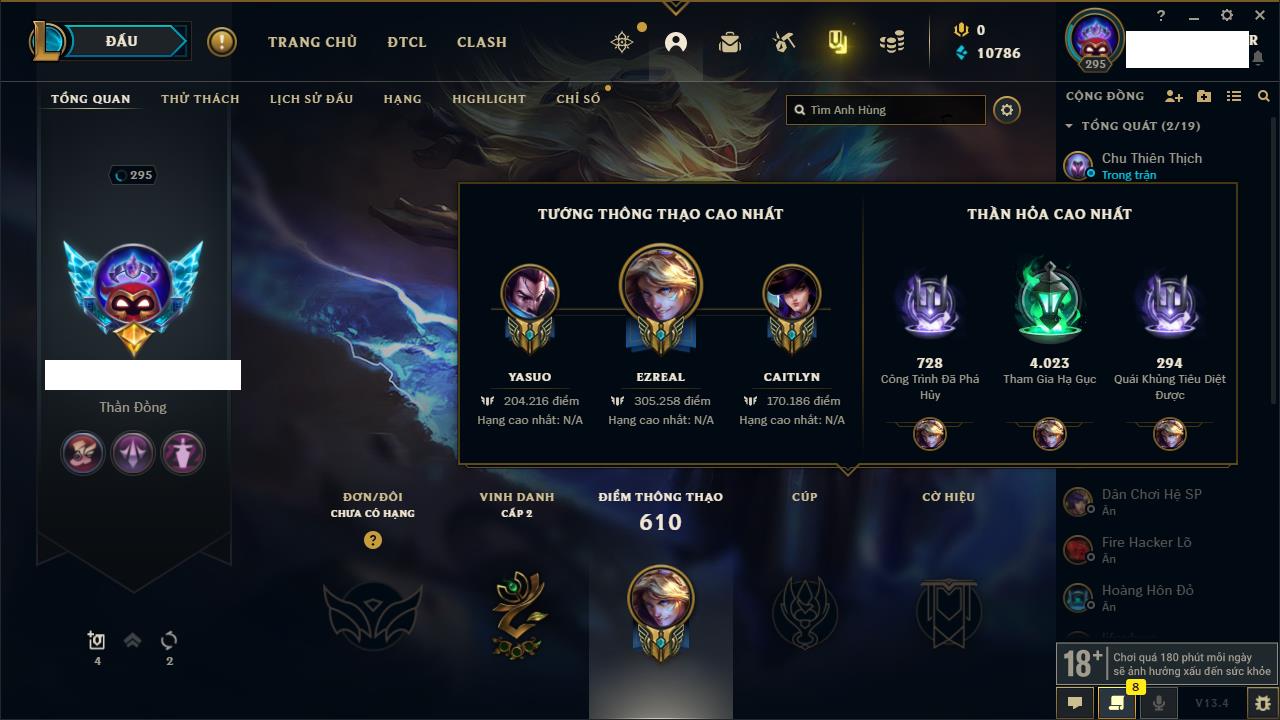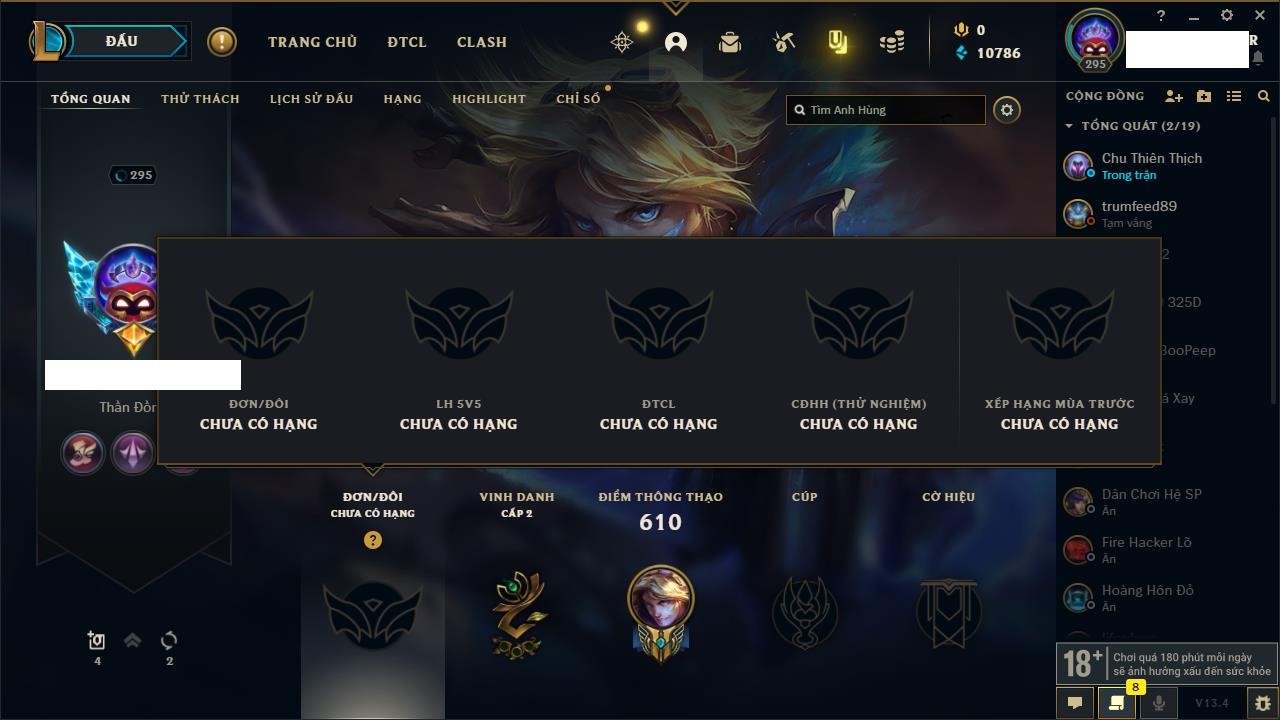 Rank Đơn: Đồng IIKhung: Chưa có khungTướng: 170 - Còn 56487 THXTrang Phục: 90Rank ĐTCL: Chưa RankLinh Thú: 129