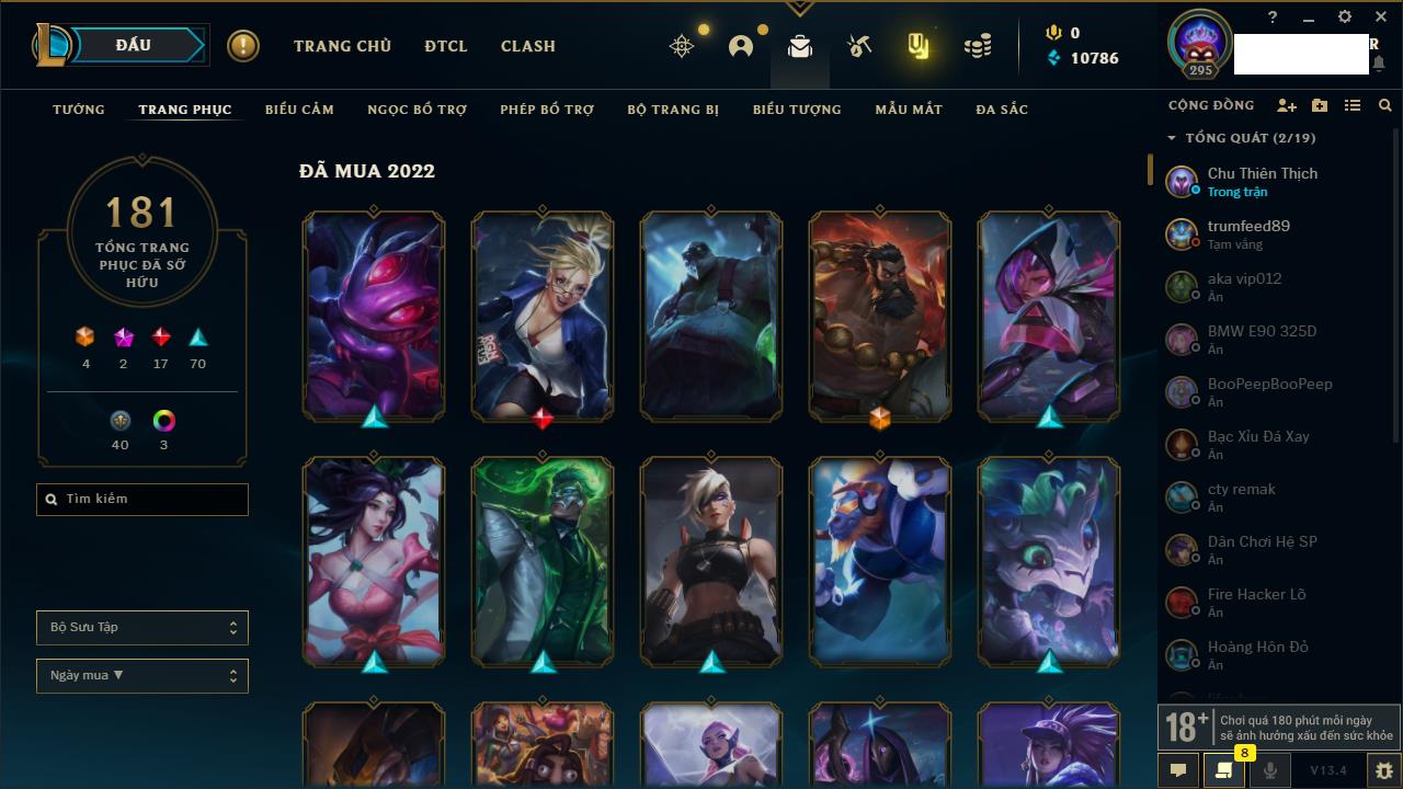 Rank Đơn: Vàng IIIKhung: VàngTướng: 170 - Còn 33222 THXTrang Phục: 136Rank ĐTCL: Chưa RankLinh Thú: 40