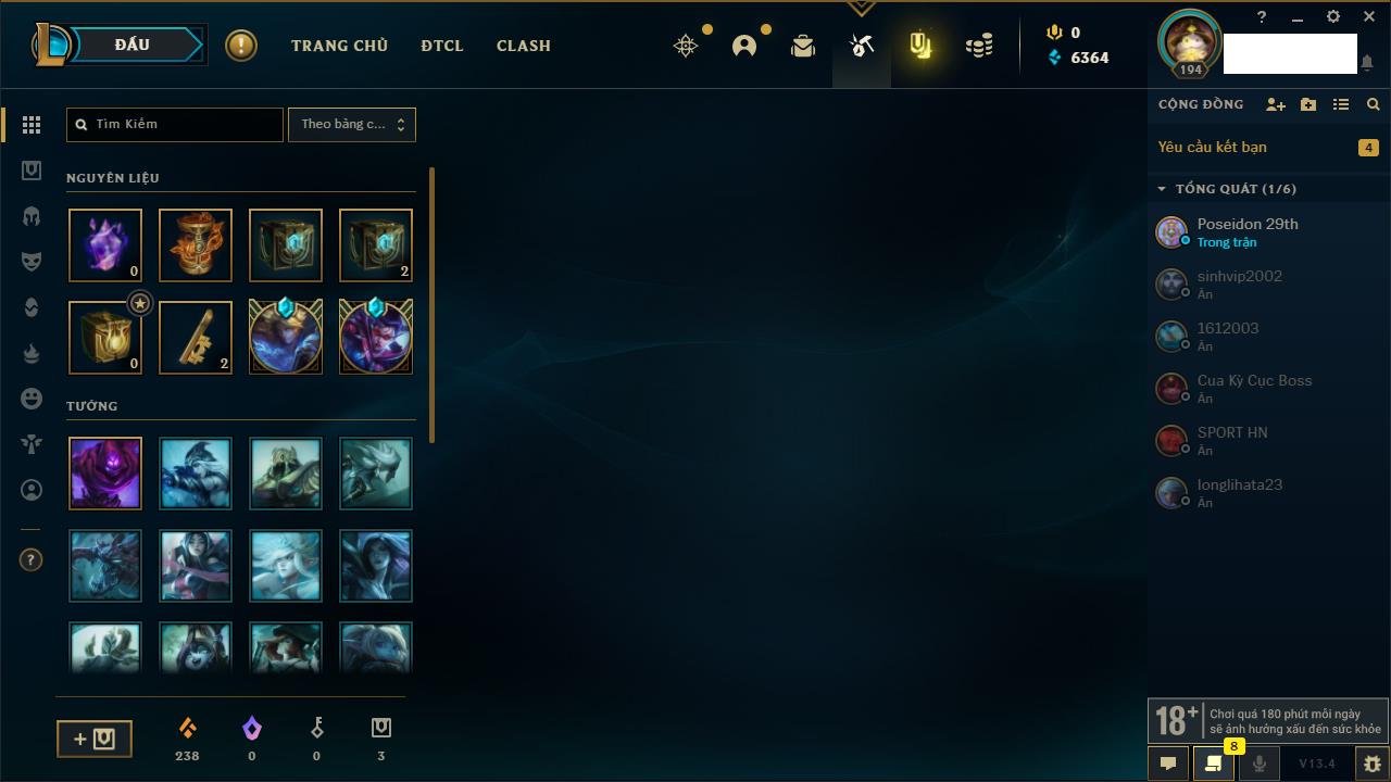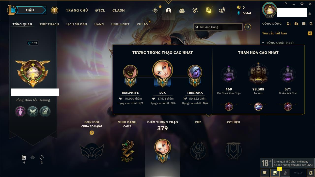 Rank Đơn: Đồng IIKhung: Chưa có khungTướng: 170 - Còn 56487 THXTrang Phục: 90Rank ĐTCL: Chưa RankLinh Thú: 129