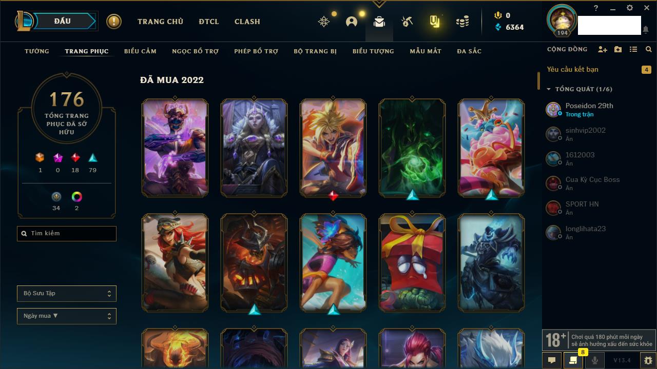 Rank Đơn: Vàng IIIKhung: VàngTướng: 170 - Còn 33222 THXTrang Phục: 136Rank ĐTCL: Chưa RankLinh Thú: 40