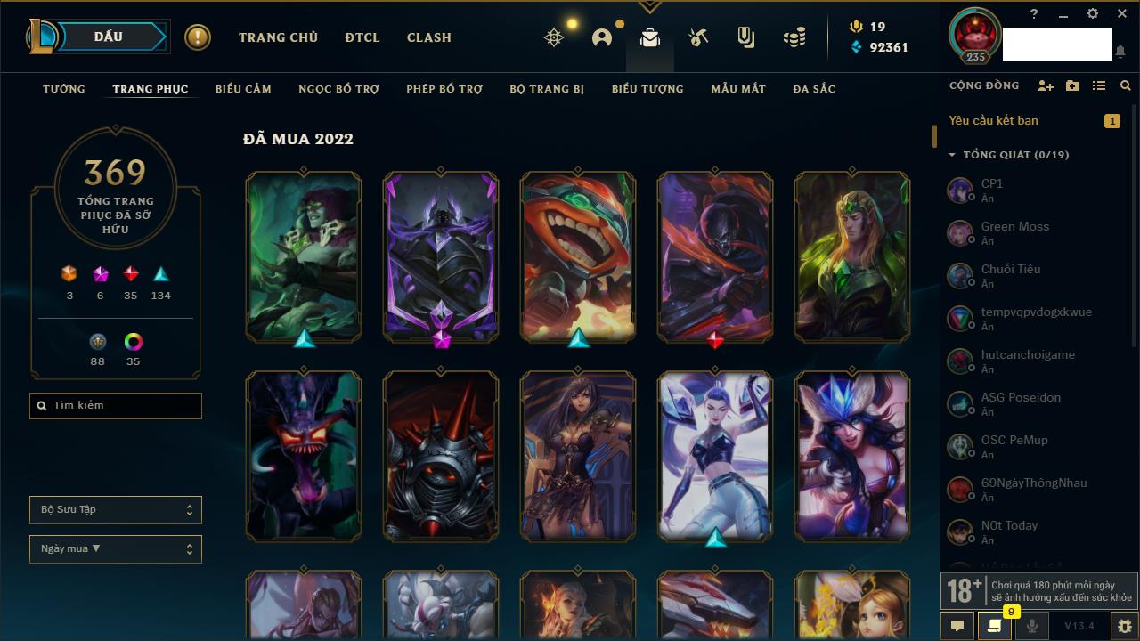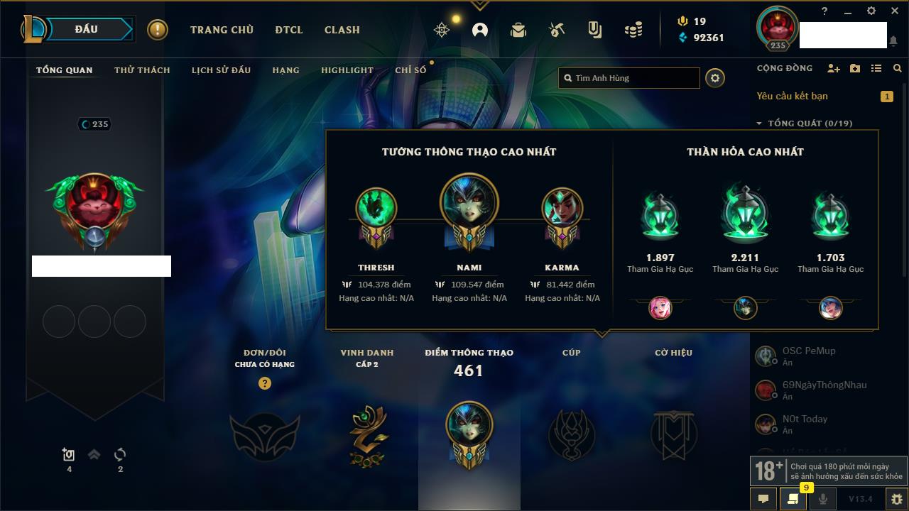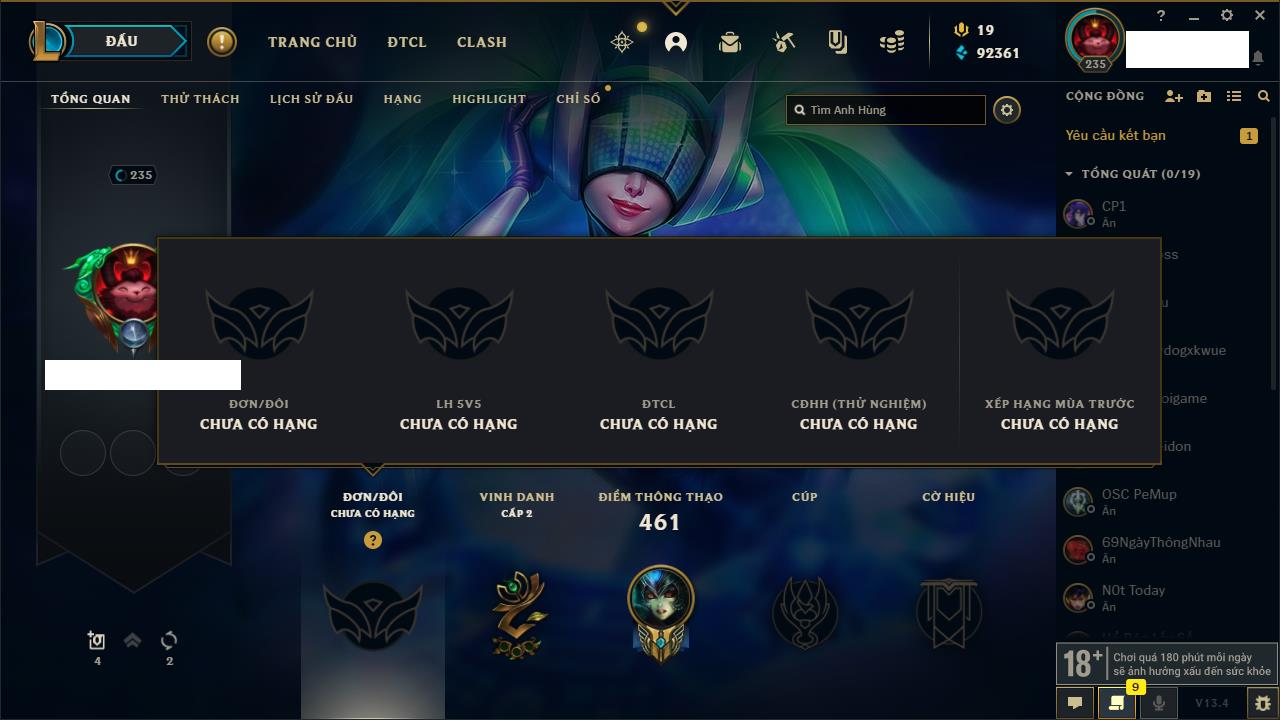 Rank Đơn: Chưa RankKhung: Chưa có khungTướng: 170 - Còn 72514 THXTrang Phục: 202Rank ĐTCL: Chưa RankLinh Thú: 191