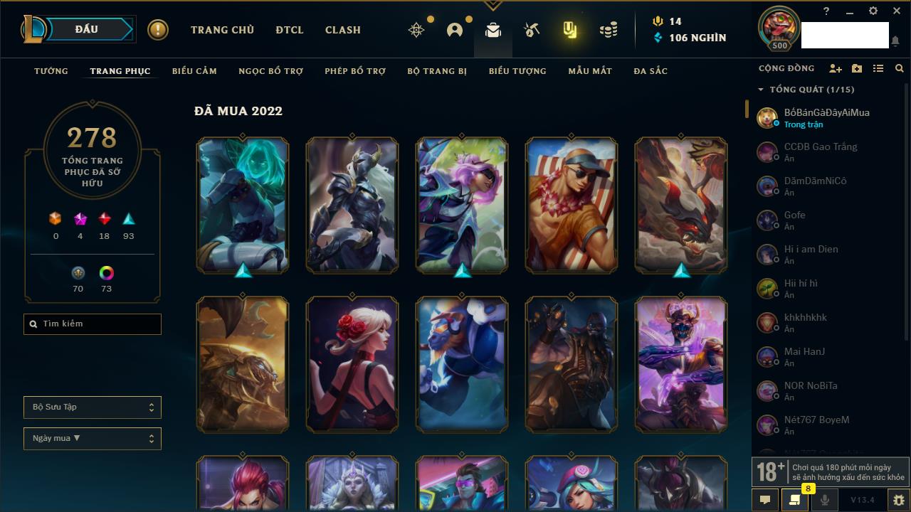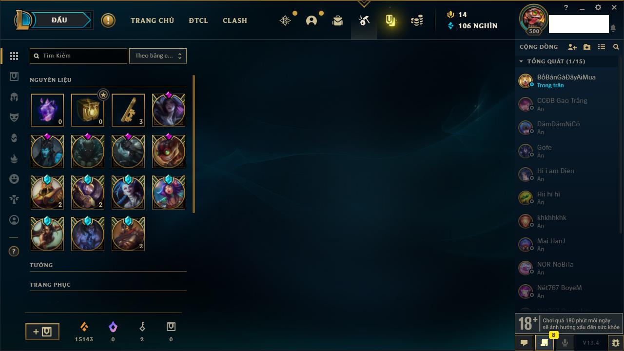 Rank Đơn: Bạc IIIKhung: BạcTướng: 170 - Còn 42417 THXTrang Phục: 262Rank ĐTCL: Chưa RankLinh Thú: 132