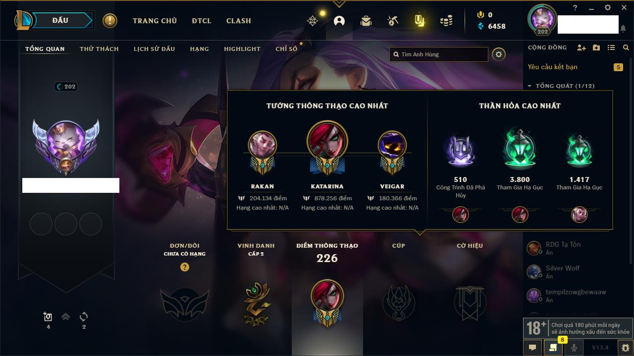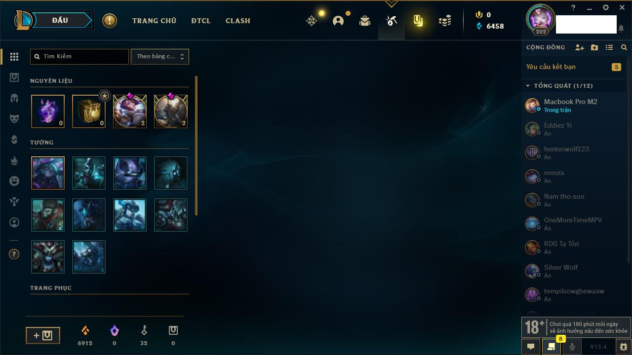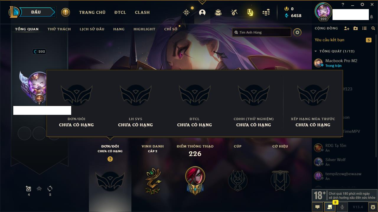 Rank Đơn: Chưa RankKhung: Chưa có khungTướng: 157 - Còn 6783 THXTrang Phục: 50Rank ĐTCL: Chưa RankLinh Thú: 37