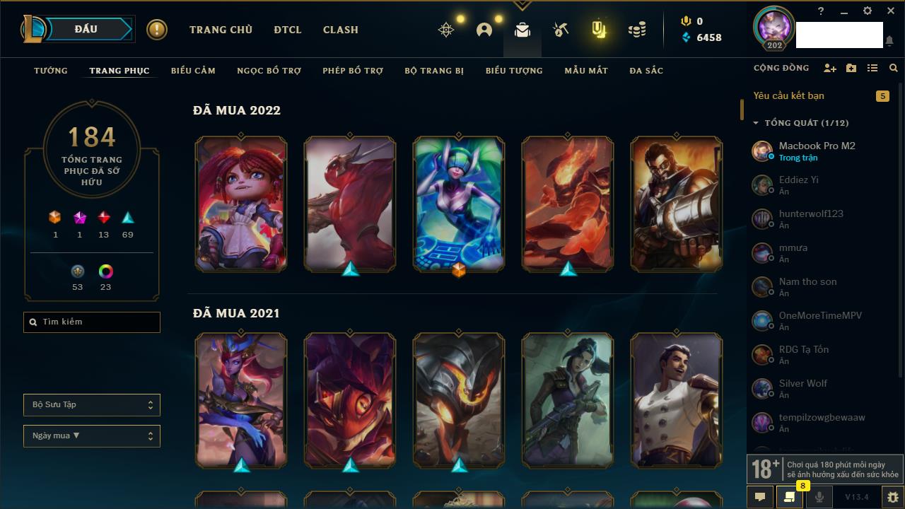 Rank Đơn: Vàng IIIKhung: VàngTướng: 170 - Còn 33222 THXTrang Phục: 136Rank ĐTCL: Chưa RankLinh Thú: 40