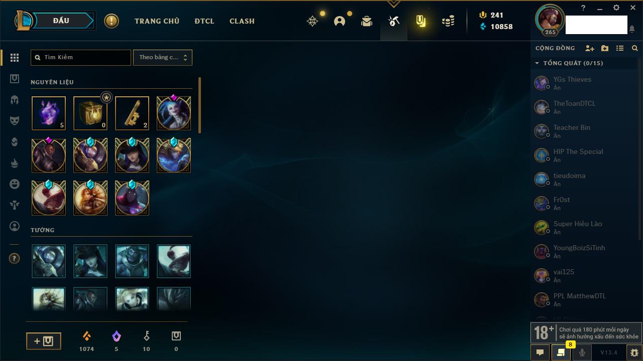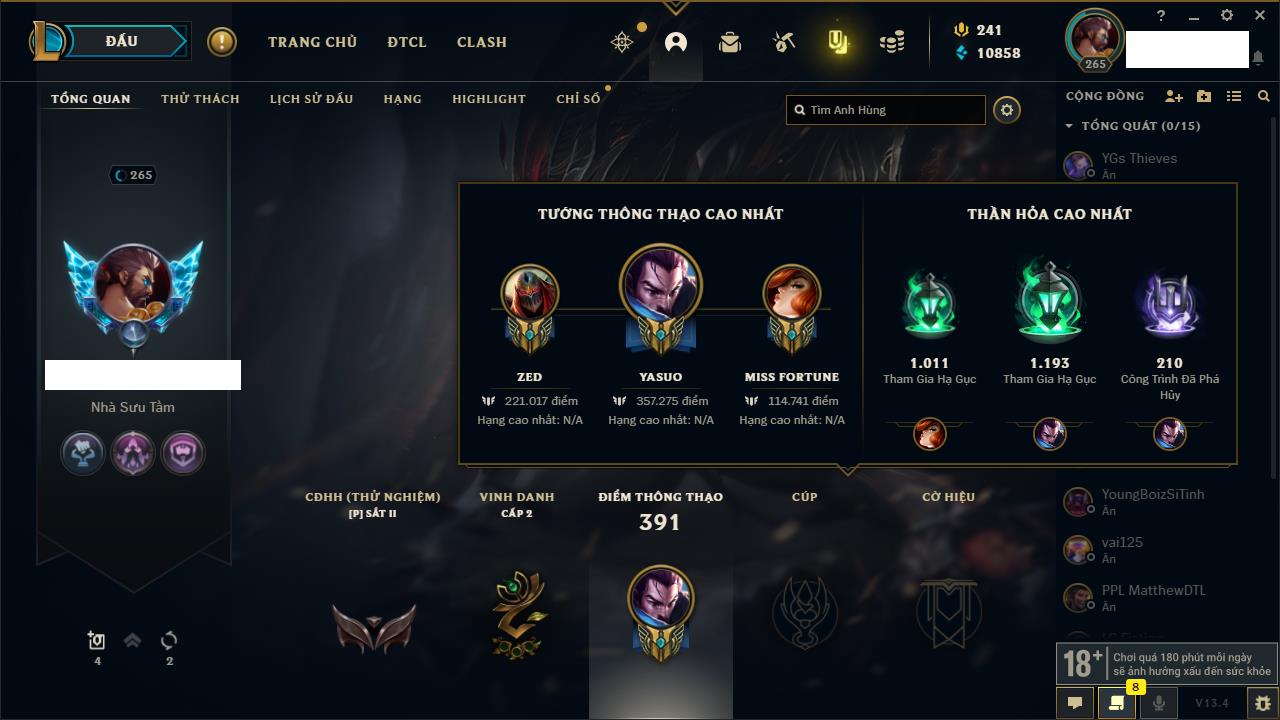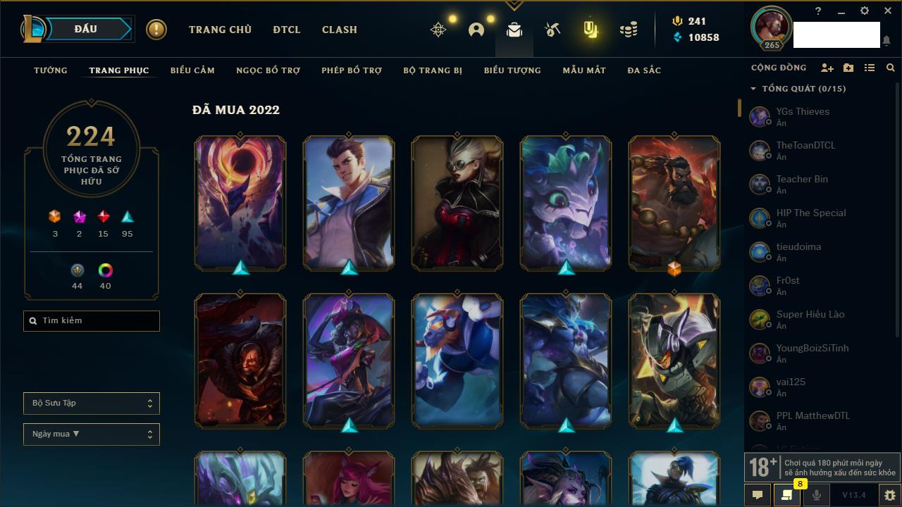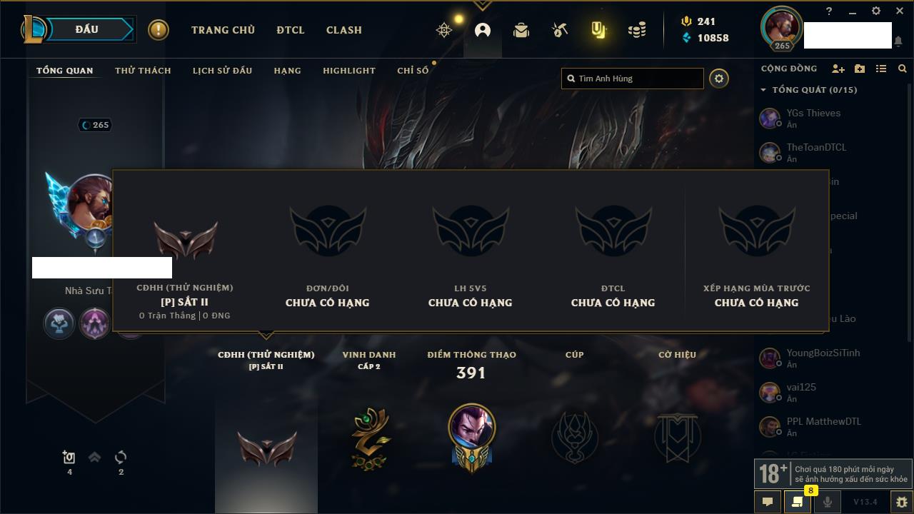 Rank Đơn: Bạc IIIKhung: BạcTướng: 171 - Còn 51045 THXTrang Phục: 220Rank ĐTCL: Sắt IILinh Thú: 141