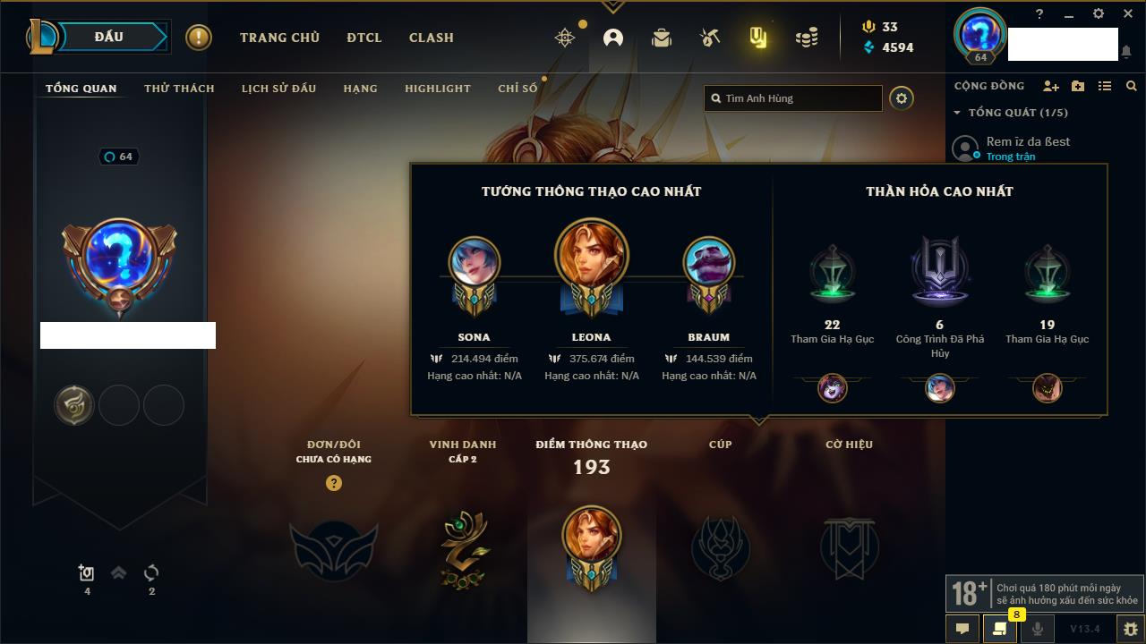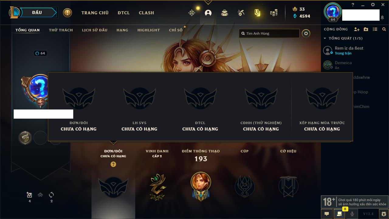Rank Đơn: Chưa rank mùa nàoKhung: Chưa có khungTướng: 0 - Còn 15550 THXTrang Phục: 0Rank ĐTCL: Chưa rank mùa nàoLinh Thú: 18