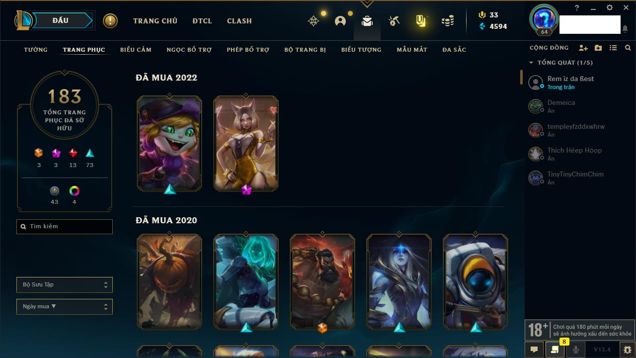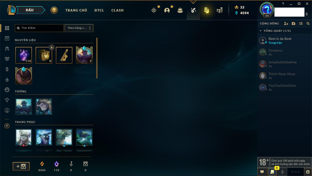 Rank Đơn: Vàng IVKhung: VàngTướng: 172 - Còn 134257 THXTrang Phục: 154Rank ĐTCL: Chưa RankLinh Thú: 57