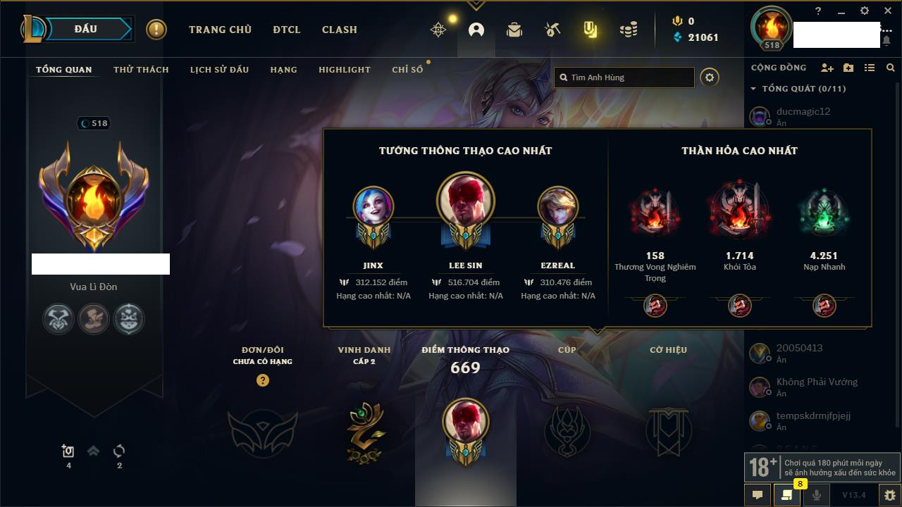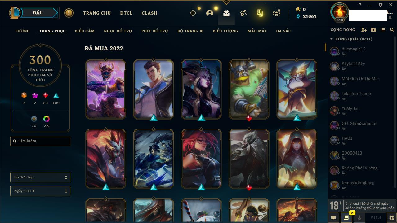 Rank Đơn: Bạch Kim IIKhung: Bạch kimTướng: 171 - Còn 316137 THXTrang Phục: 89Rank ĐTCL: Bạch Kim IIILinh Thú: 94