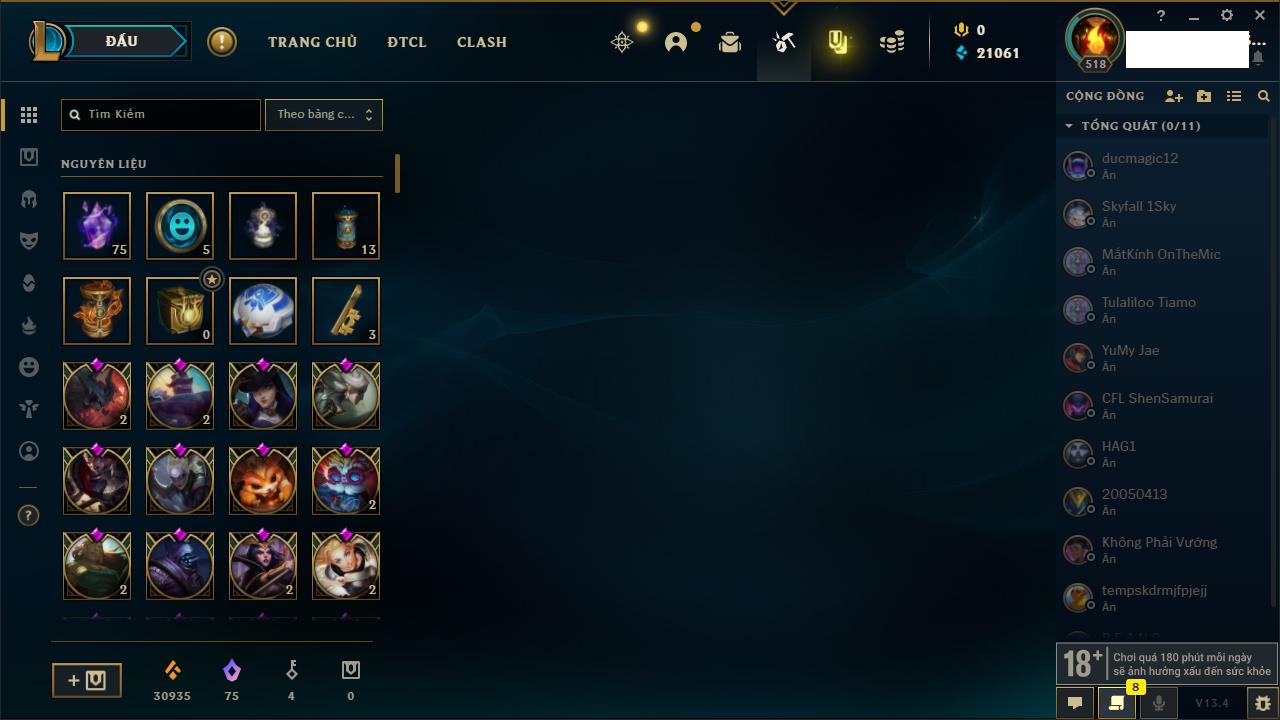 Rank Đơn: Lục Bảo IVKhung: VàngTướng: 171 - Còn 154648 THXTrang Phục: 203Rank ĐTCL: Bạch Kim IVLinh Thú: 69