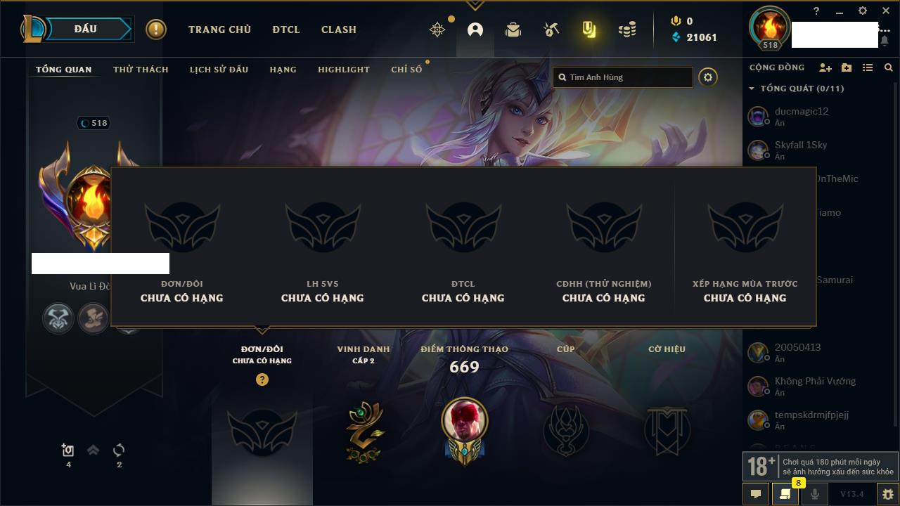 Rank Đơn: Đồng IIKhung: ĐồngTướng: 170 - Còn 95773 THXTrang Phục: 170Rank ĐTCL: Chưa RankLinh Thú: 32