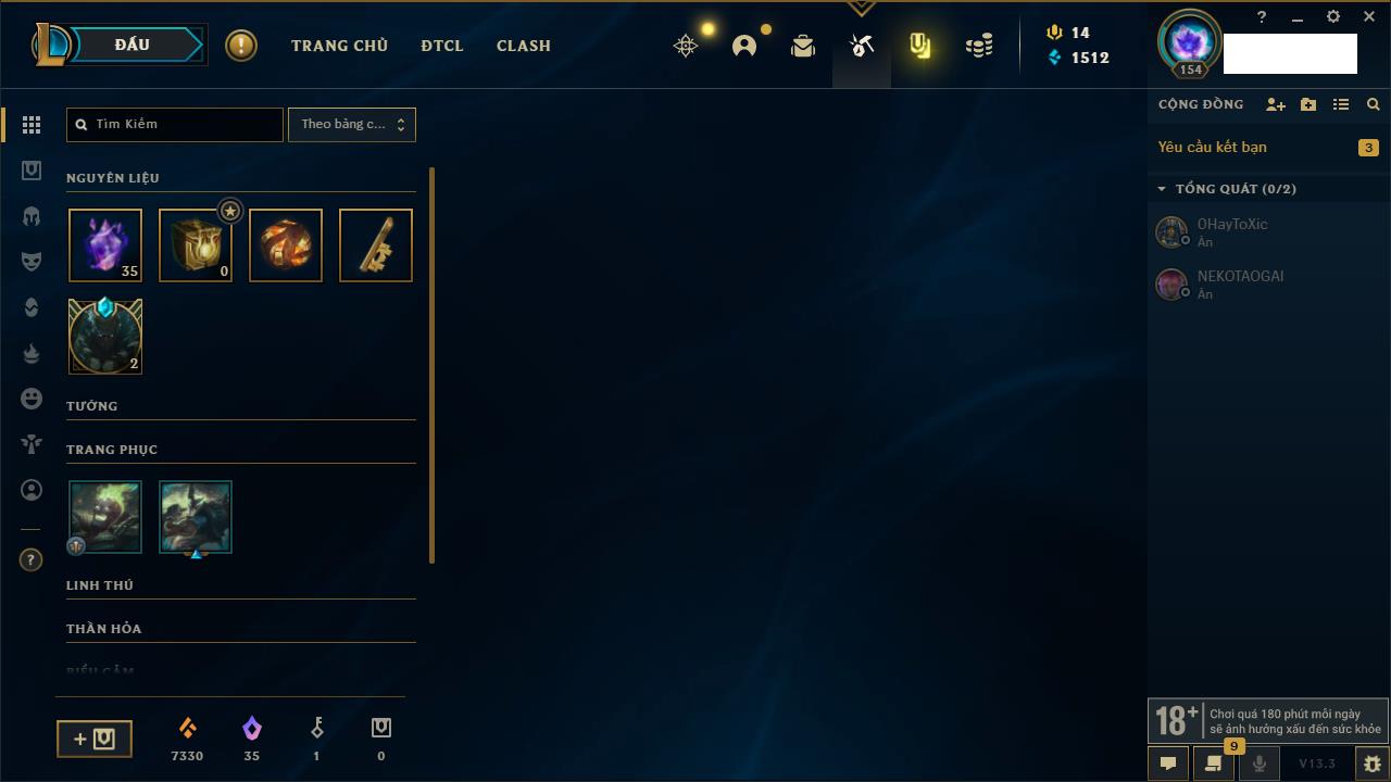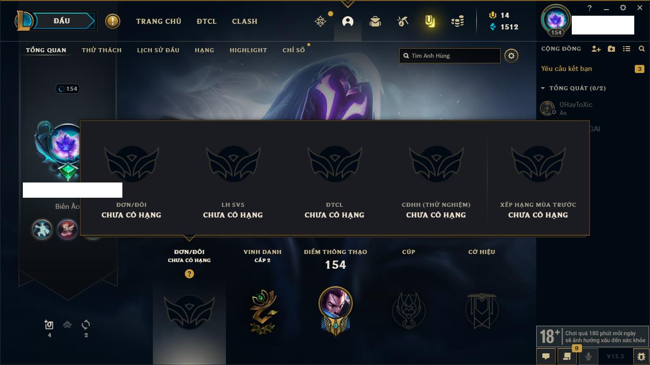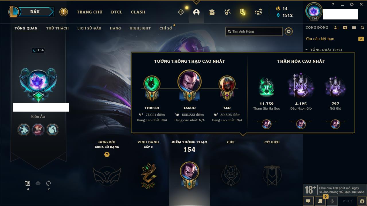 Rank Đơn: Vàng IKhung: BạcTướng: 171 - Còn 60584 THXTrang Phục: 286Rank ĐTCL: Vàng IIILinh Thú: 117