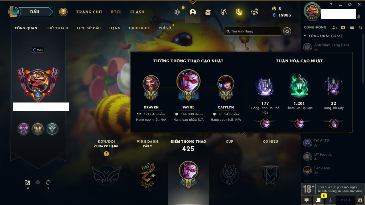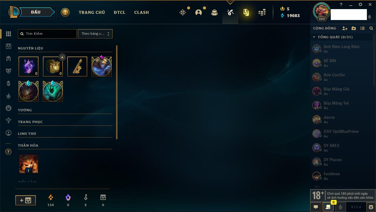 Rank Đơn: Đồng IIKhung: Chưa có khungTướng: 170 - Còn 56487 THXTrang Phục: 90Rank ĐTCL: Chưa RankLinh Thú: 129