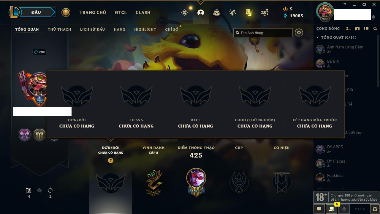 Rank Đơn: Vàng IVKhung: VàngTướng: 146 - Còn 89110 THXTrang Phục: 63Rank ĐTCL: Vàng IIILinh Thú: 41