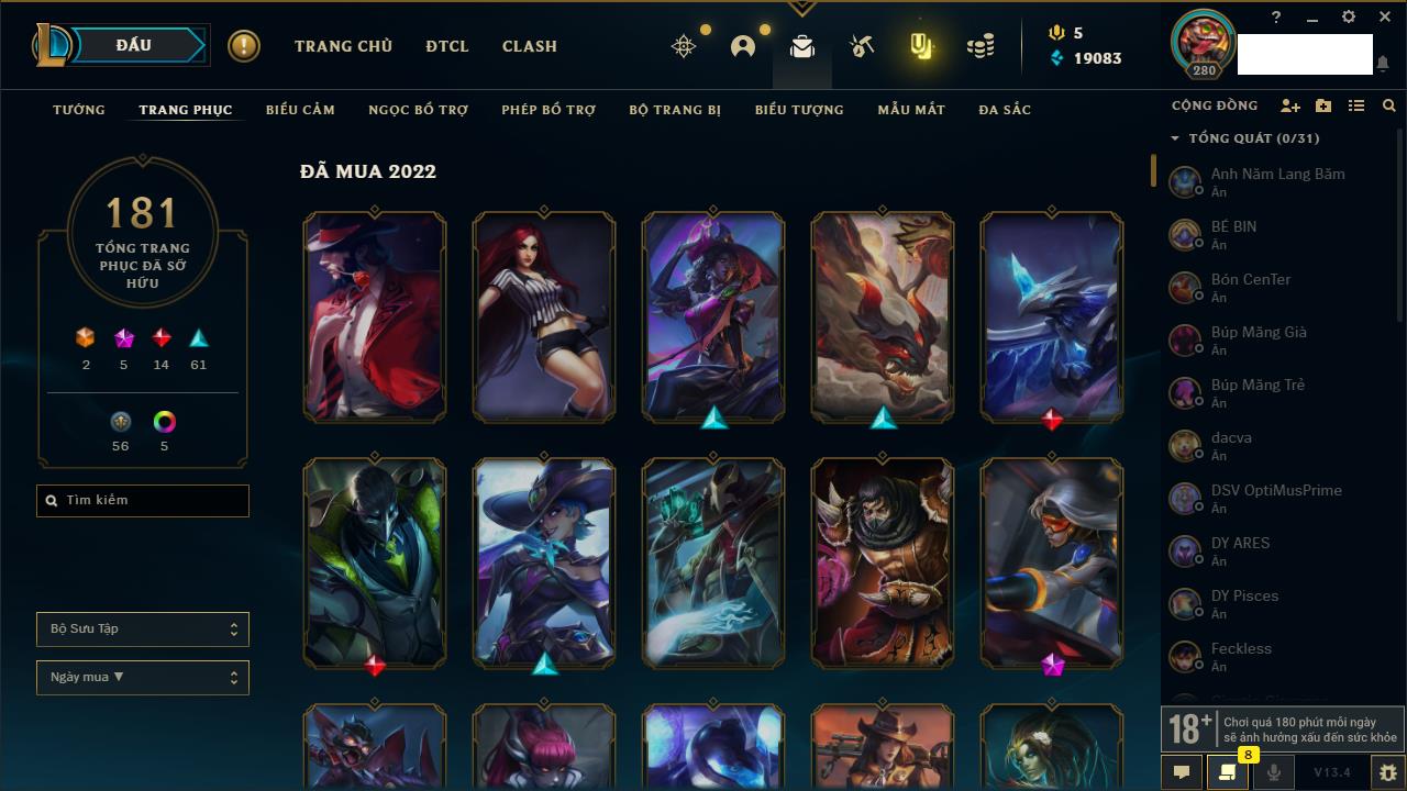 Rank Đơn: Vàng IIIKhung: VàngTướng: 170 - Còn 33222 THXTrang Phục: 136Rank ĐTCL: Chưa RankLinh Thú: 40