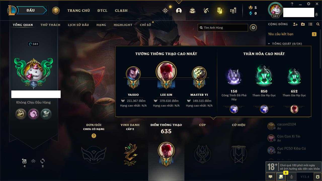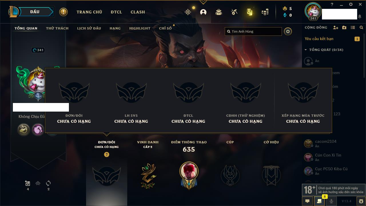 Rank Đơn: Sắt IVKhung: Chưa có khungTướng: 171 - Còn 9586 THXTrang Phục: 280Rank ĐTCL: Chưa RankLinh Thú: 114