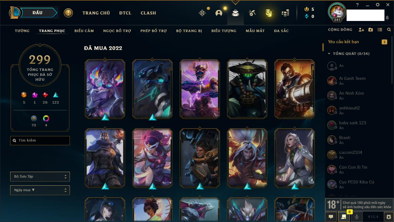 Rank Đơn: Bạc IIIKhung: BạcTướng: 170 - Còn 42417 THXTrang Phục: 262Rank ĐTCL: Chưa RankLinh Thú: 132