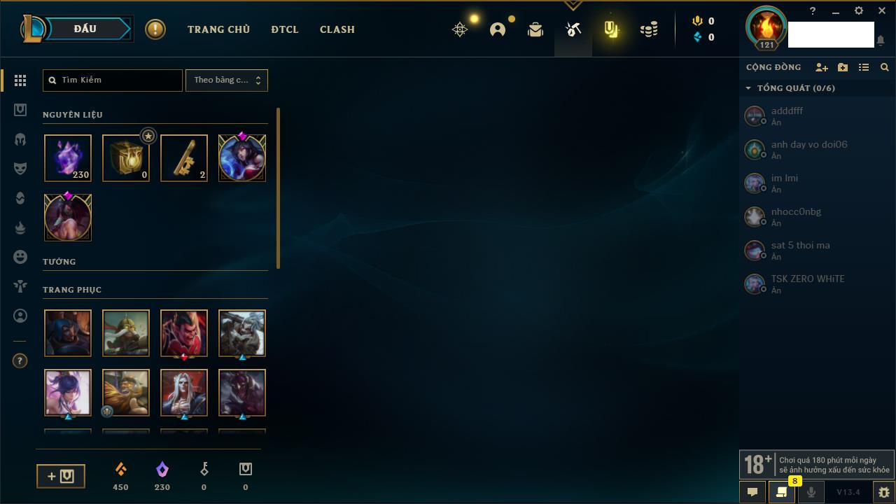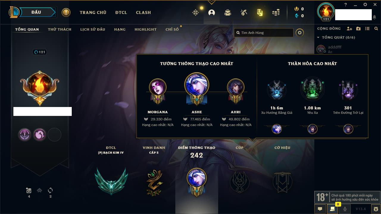 Rank Đơn: Vàng IVKhung: BạcTướng: 171 - Còn 426239 THXTrang Phục: 162Rank ĐTCL: Chưa RankLinh Thú: 33