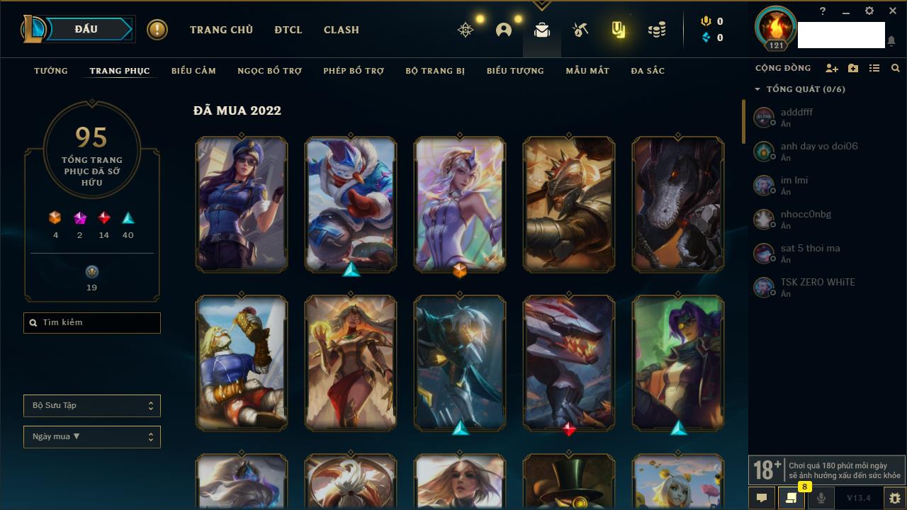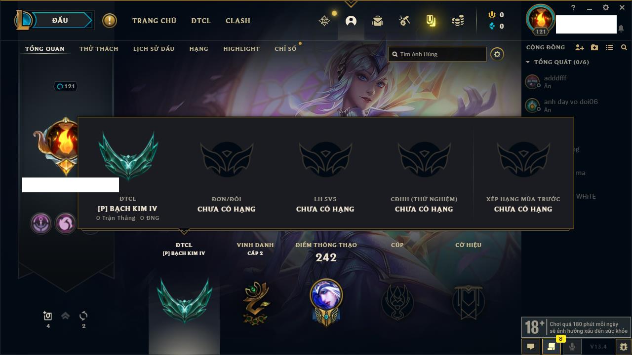 Rank Đơn: Vàng IVKhung: VàngTướng: 171 - Còn 48721 THXTrang Phục: 171Rank ĐTCL: Chưa RankLinh Thú: 27