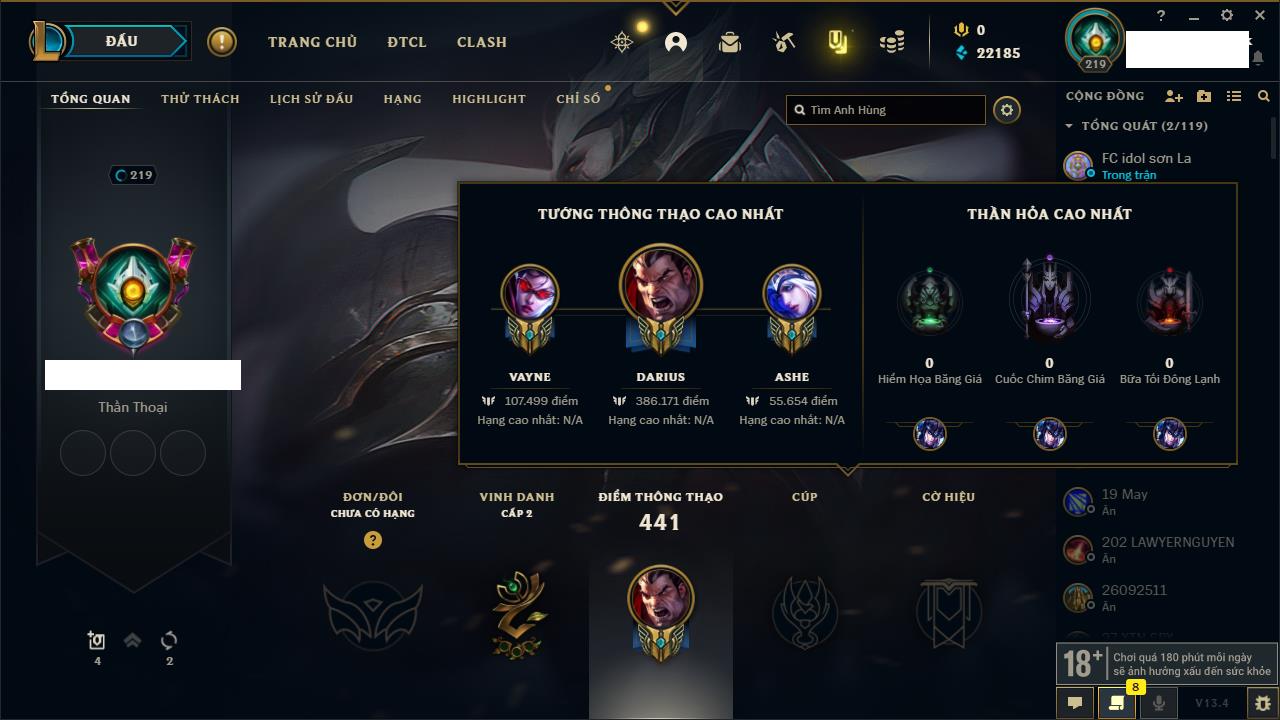 Rank Đơn: Bạch Kim IIKhung: Bạch kimTướng: 171 - Còn 316137 THXTrang Phục: 89Rank ĐTCL: Bạch Kim IIILinh Thú: 94